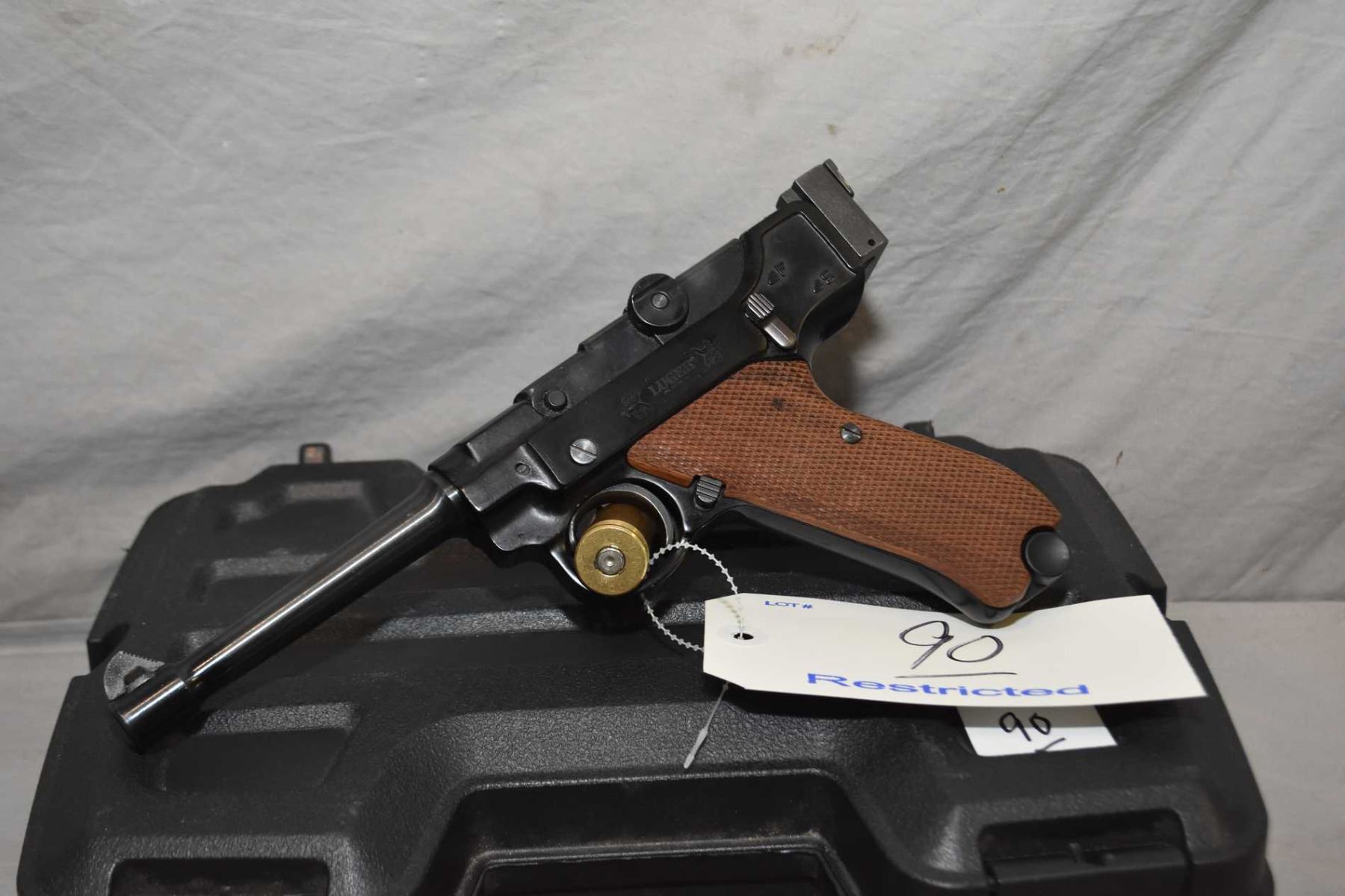 Luger by Stoeger Model Luger 22 .22 LR Cal 10 Shot Semi Auto Pistol w/ 140 mm bbl [ blued finish, appears excellent, wooden grips, few slight marks to wood and metal, Copy of the Swiss Bren Luger only in .22 Cal, c/w foam lined black plastic case ] Ser # 104611 Restricted Handgun Cert # 13465297 FRT # 24272 - 4