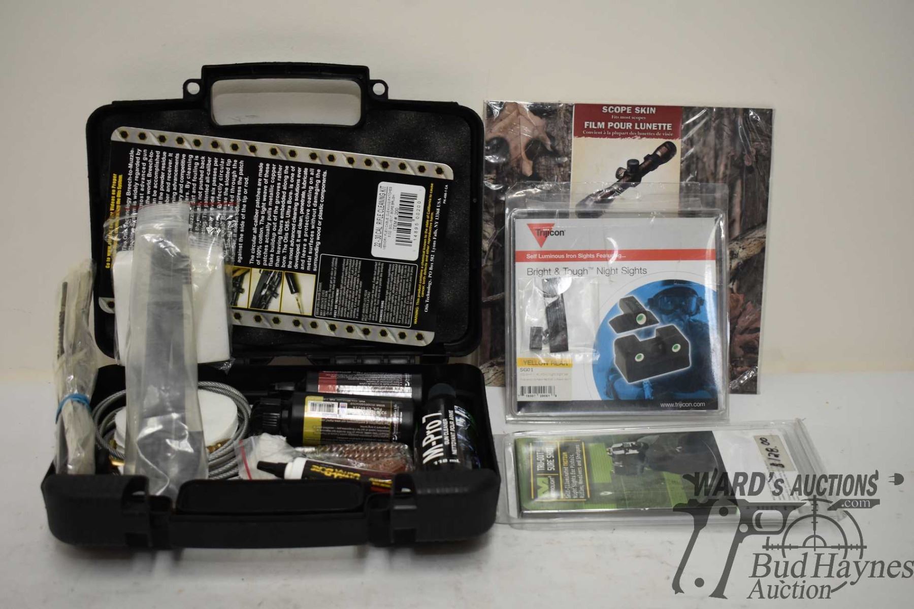 M-Pro 7 tactical universal cleaning kit, a Mossy Oak scope skin kit, Tru-Dot self illuminating tritium night sight for pistols, rifles, revolvers and shotguns, and a Trijicon self luminous iron sight SG01 sig 9mm