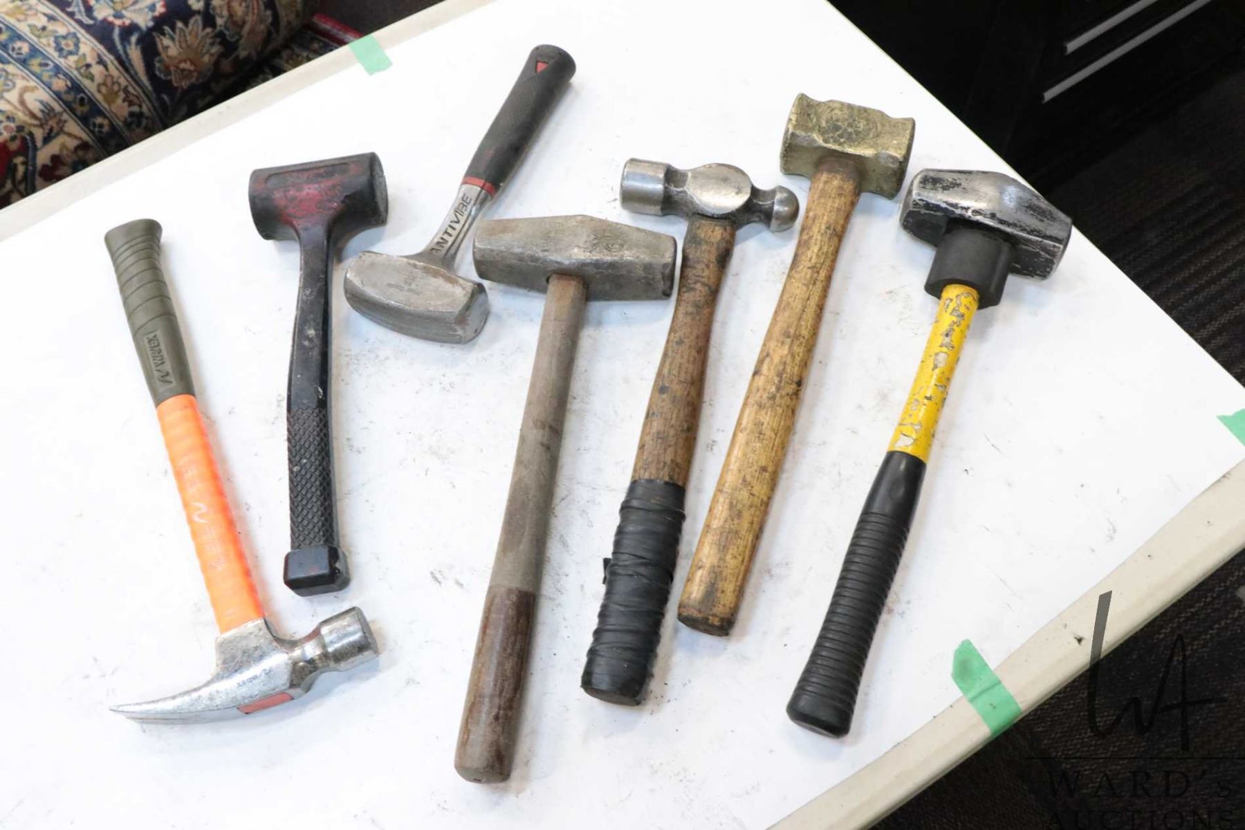 Mac Tool anti-vibe sledge hammer, a Weaver claw hammer, 2 lbs. deep blow hammer, brass head hammer, 4 lbs. sledge hammer and a ball peen hammer