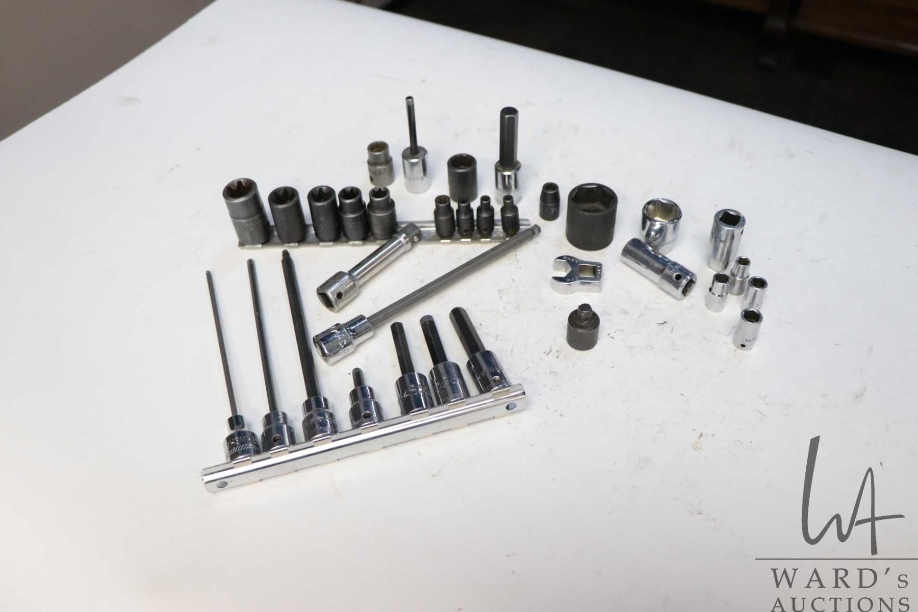 Mac Tools 3/8" drive tools including hex head 3, 4, 5, 8, 9, and 10mm, 3/16" and 1/4", six point star impact bits including E10, E12, E14, E16 and E18, shallow sockets 9/16", 17mm, 3/8" 12 point impact, a 1/2" 12 point impact, a 22mm impact aand a 1/4" impact, deep sockets including 7/16", 3/8"-1/4" impact adapter, a 1" and a 3" extension, 13mm crow foot, 1/4" drive including E4, E5, E6 and E8, 7/32", 1/4", 5/16" and 6mm