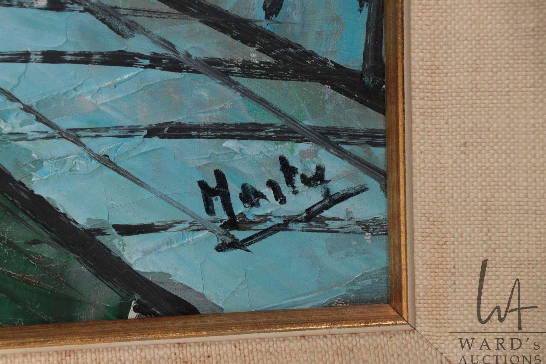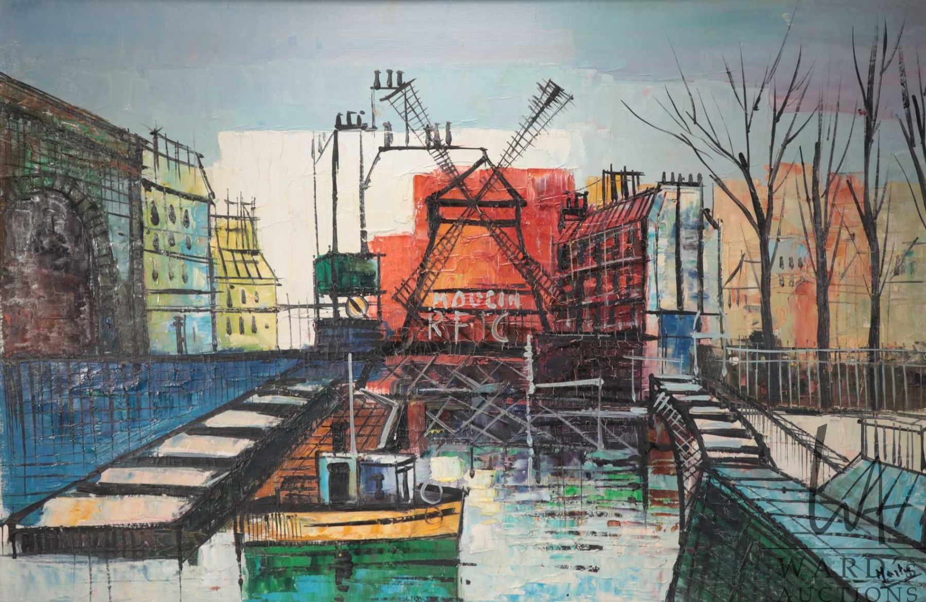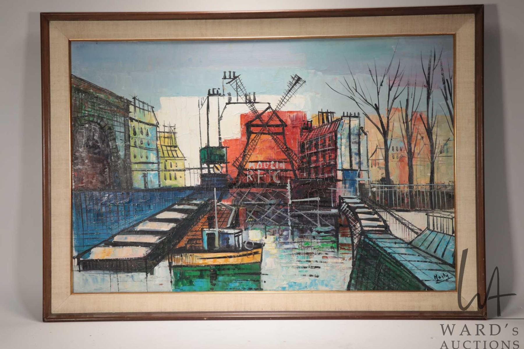 Maity (?) framed acrylic on canvas MCM painting of the Moulin Rouge, 24" X 36"