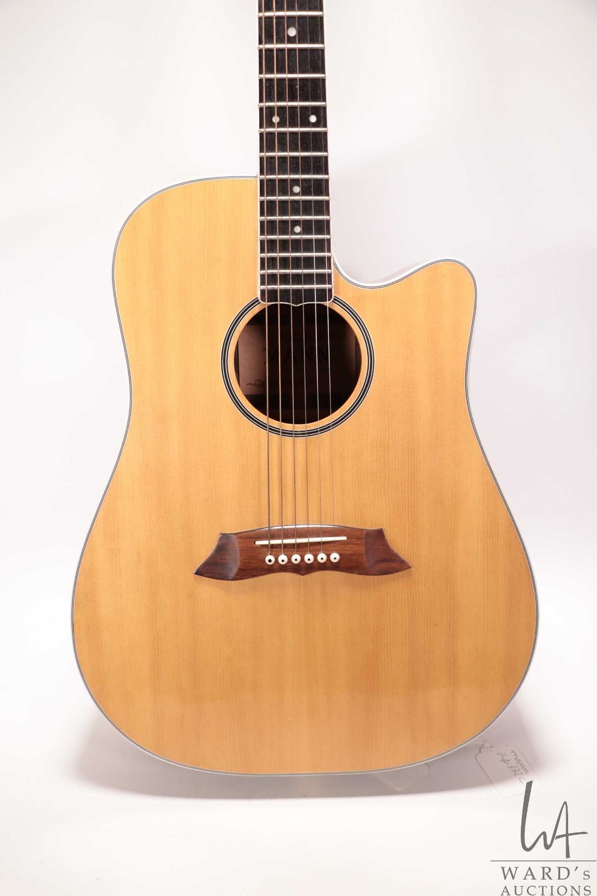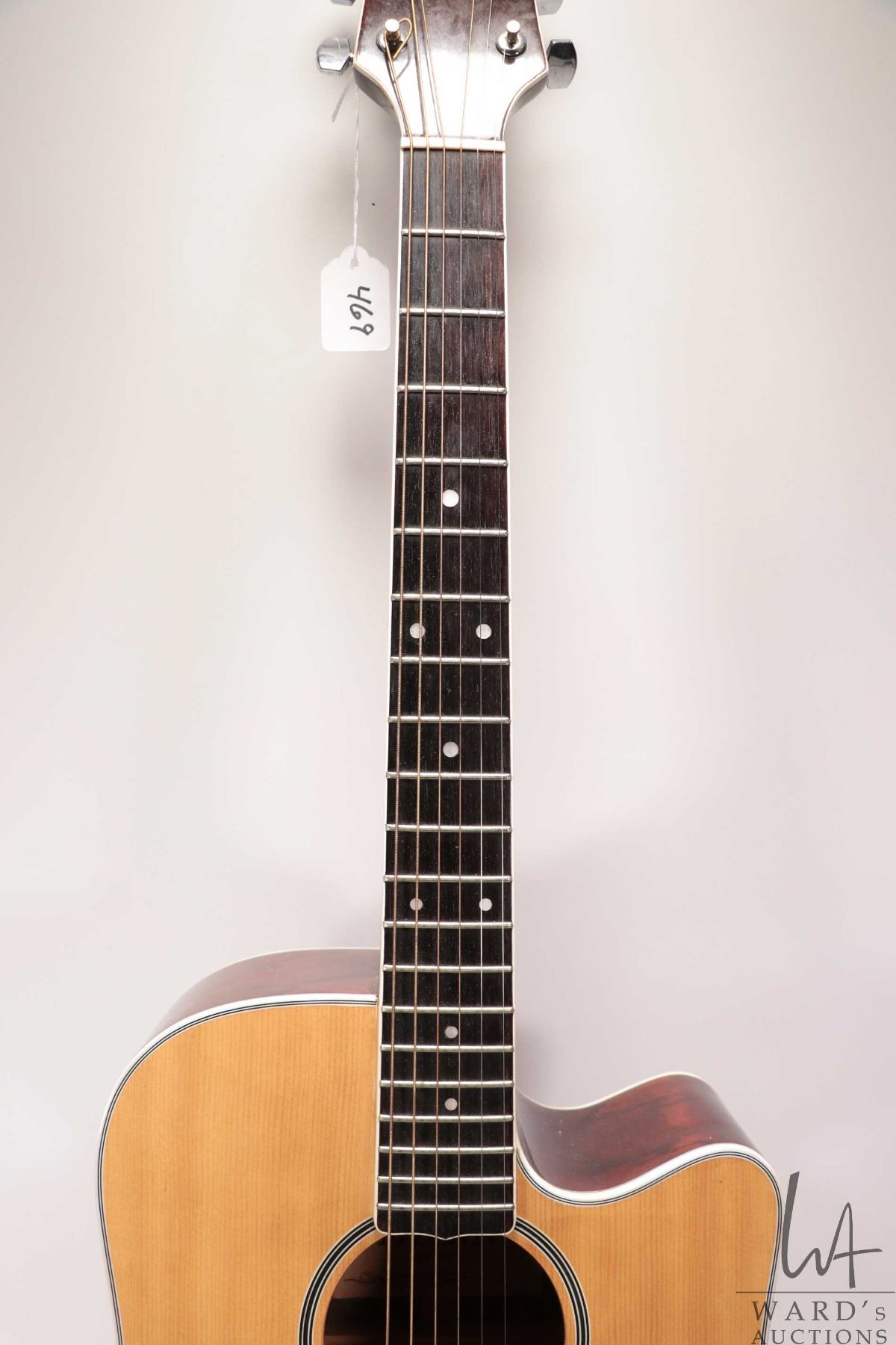 Mann cutaway guitar. Two tone maple top, walnut sides, back deep body dreadnaught, cutaway acoustic, ebony neck, triple binding on body and neck