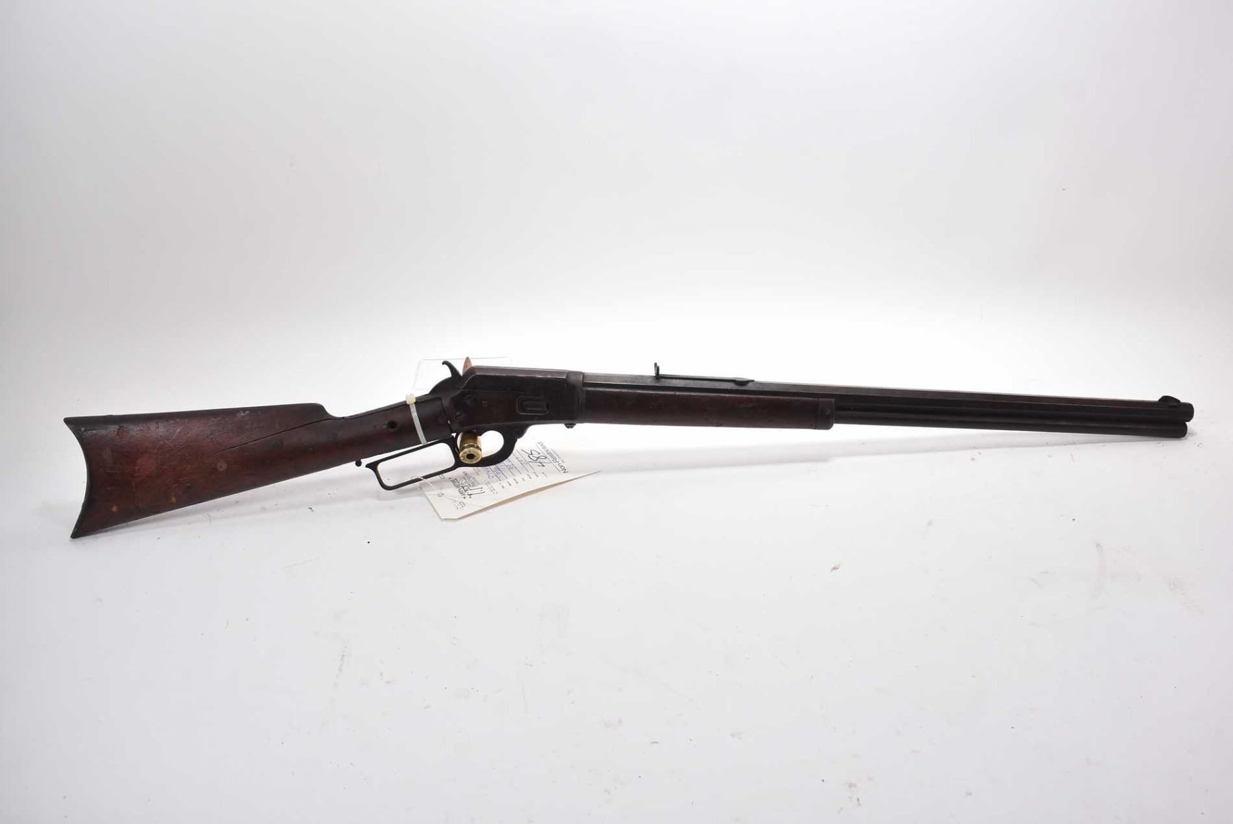 Marlin Model 1889 .38 W Cal Lever Action Rifle w/ 24" octagon bbl full mag [ blued finish turning to a mottled brown color, back sight missing the lift, fair forend, crack, broken, pinned and nailed poor butt stock, w/ crescent butt plate, Note : bolt with washer in front of lever, various marks to wood and scratches to wood and metal ] Ser # 37446