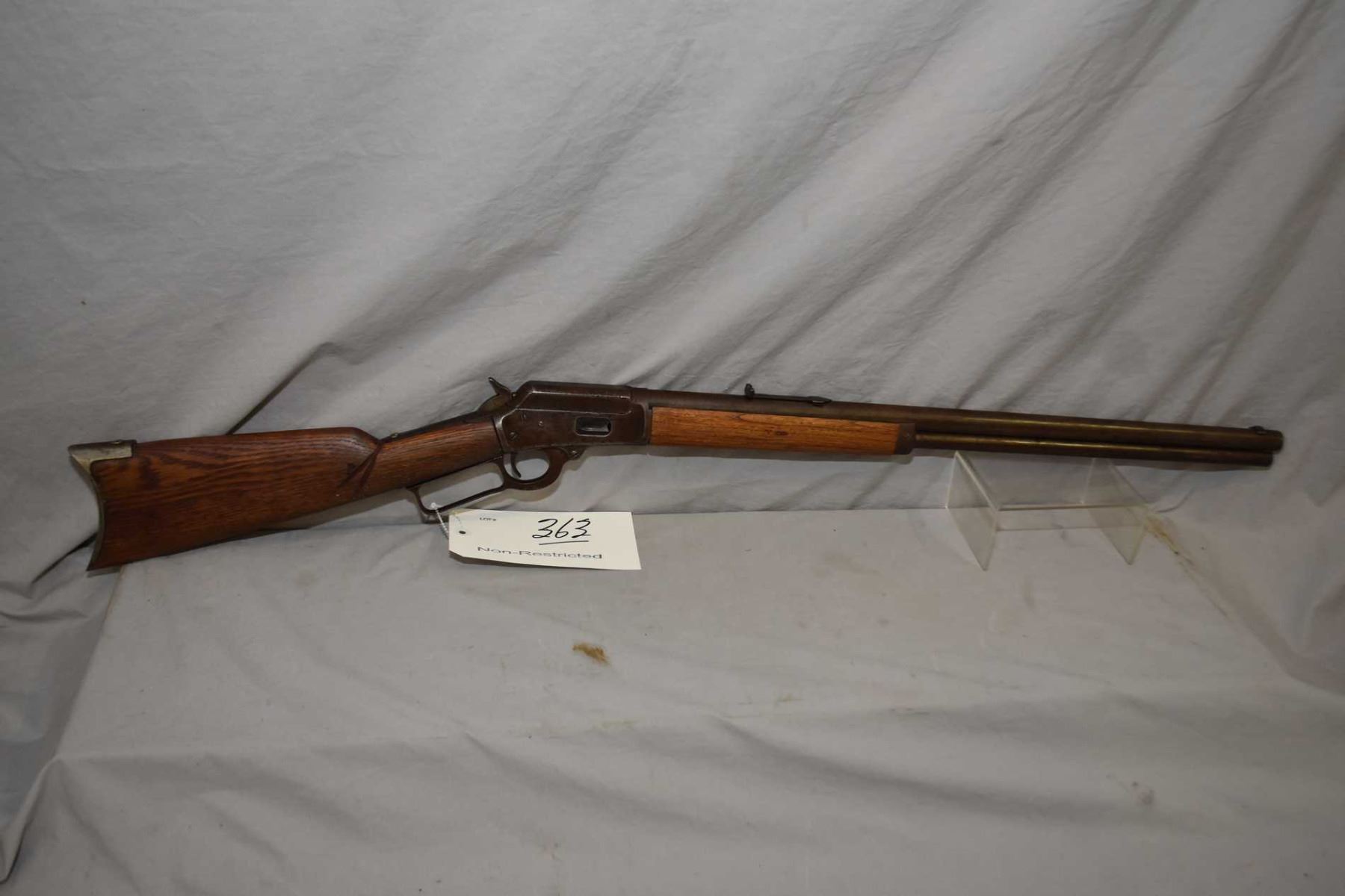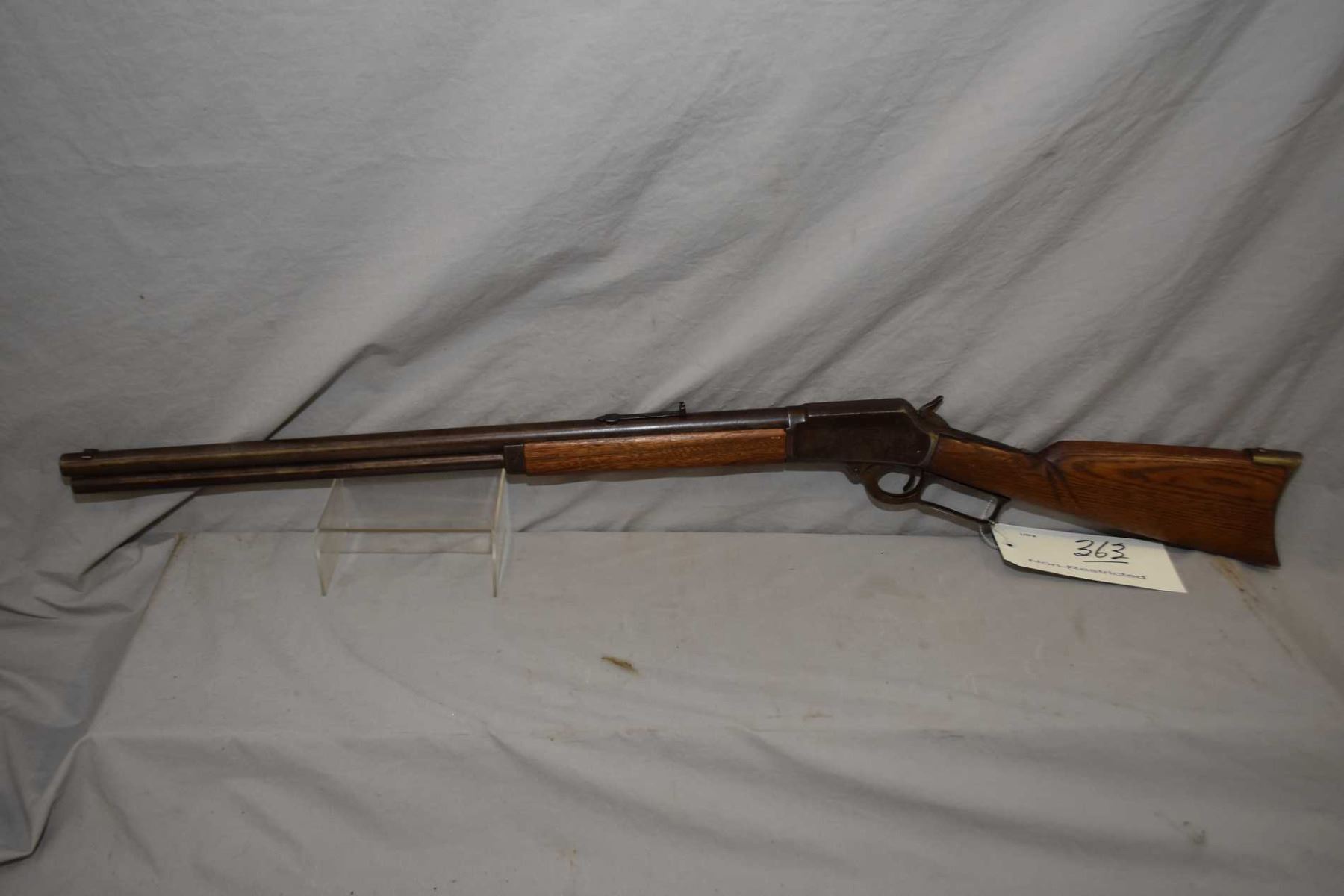 Marlin Model 1894 .44 W Cal Tube Fed Lever Action Rifle w/ 24" rnd bbl full mag [ fading blue finish turned brown with some light rust and pitting, barrel sights missing the lift, replaced wood with metal crescent butt plate, various marks and scratches to wood and metal ] Ser # 144347