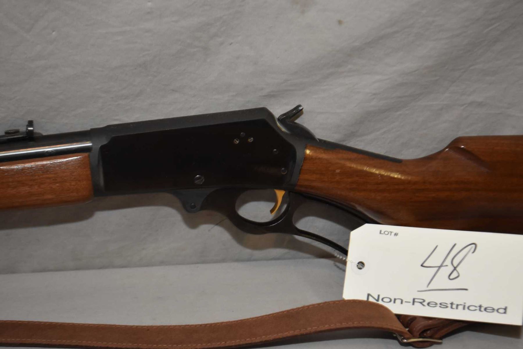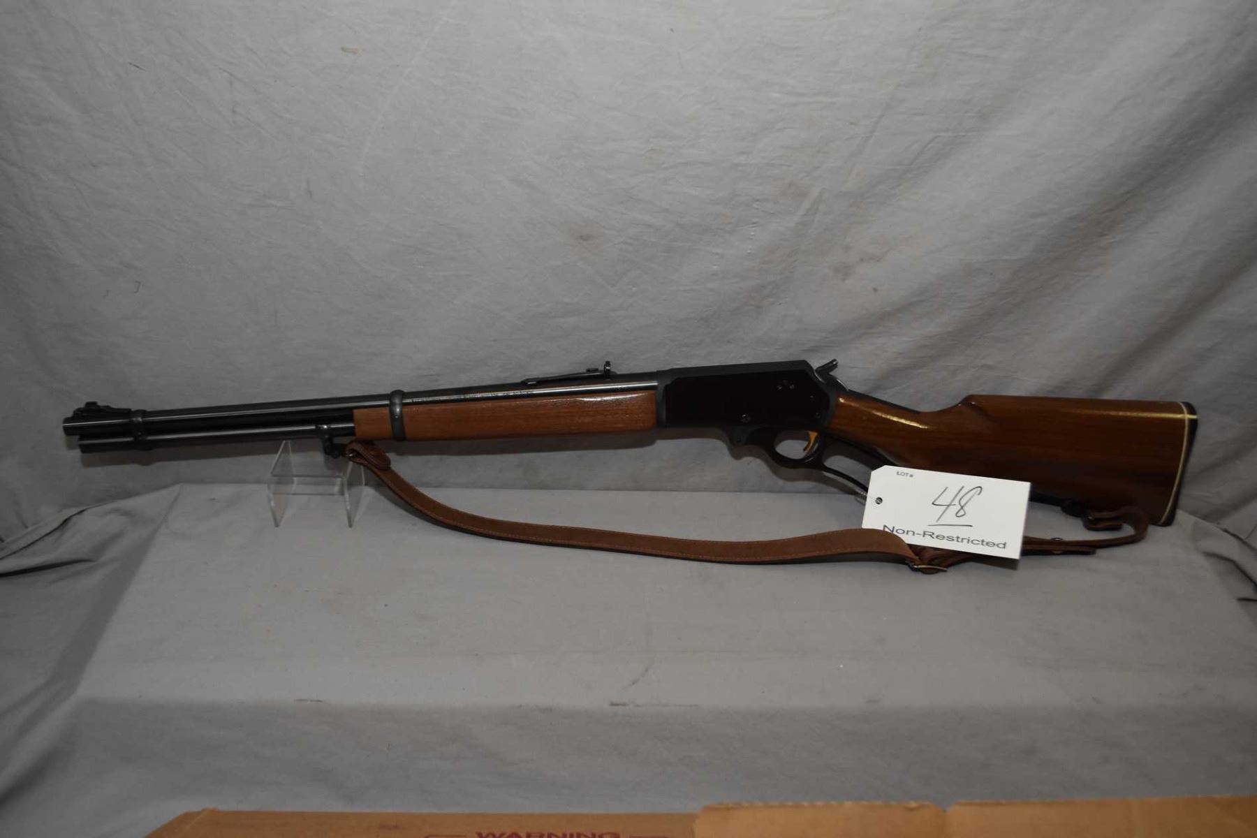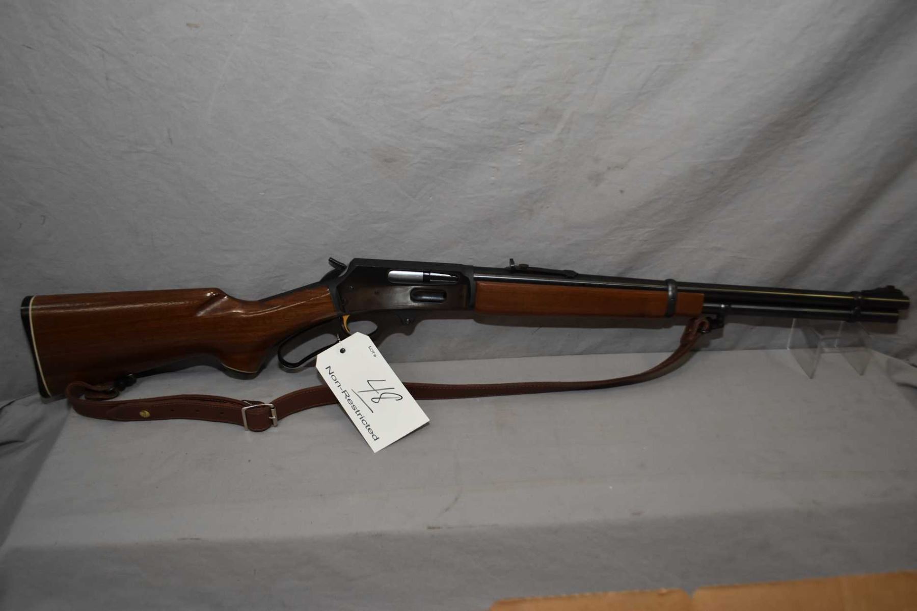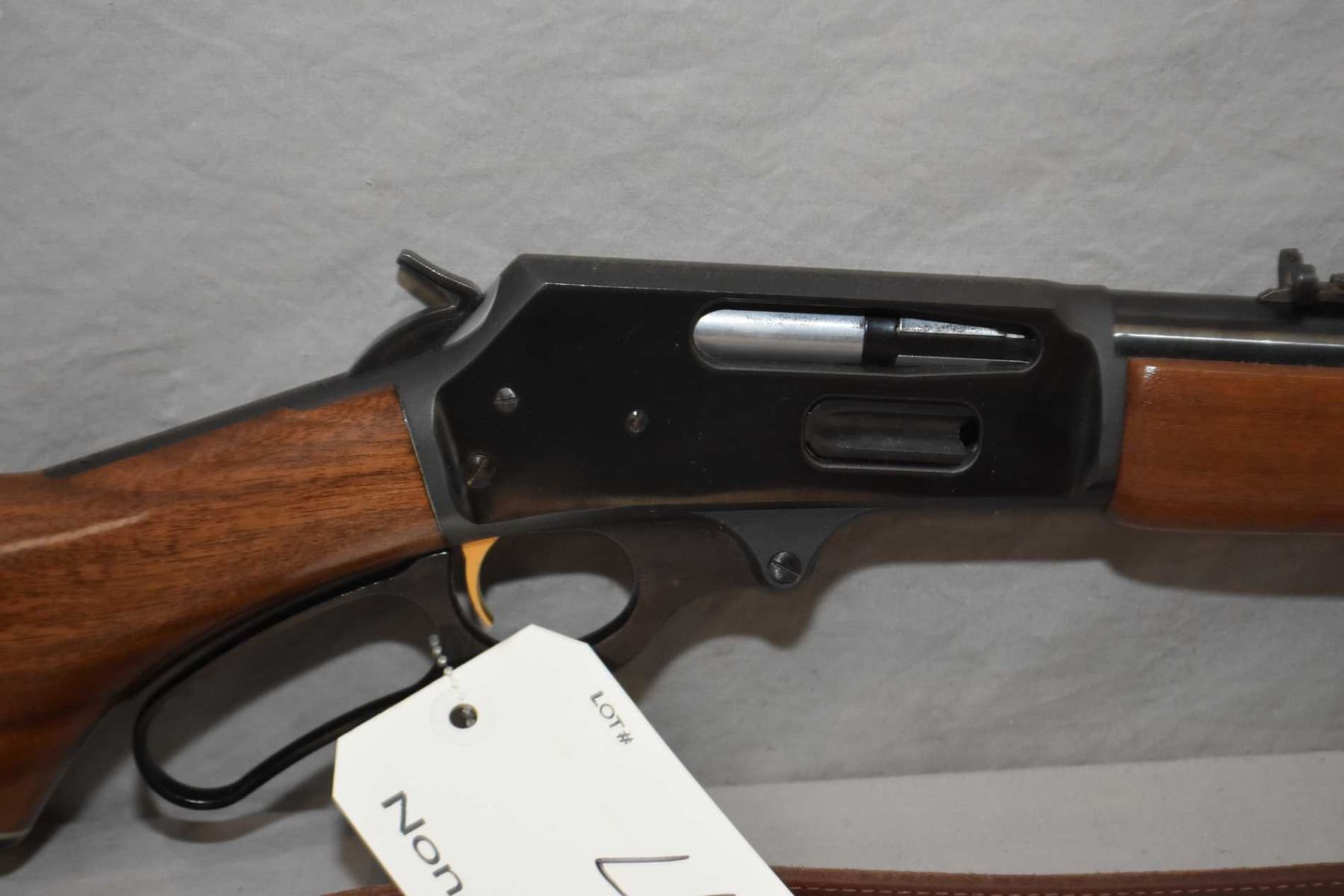 Marlin Model 336 .30 - 30 Win Cal Lever Action Rifle w/ 20" bbl [ appears v - good, in original box, with Marlin pocket guide, blued finish, barrel sights, pistol grip stock and forend, w/ Marlin butt plate, gold plated trigger, leather sling w/ quick off swivels, few slight marks to wood and metal ] Ser # 19090706