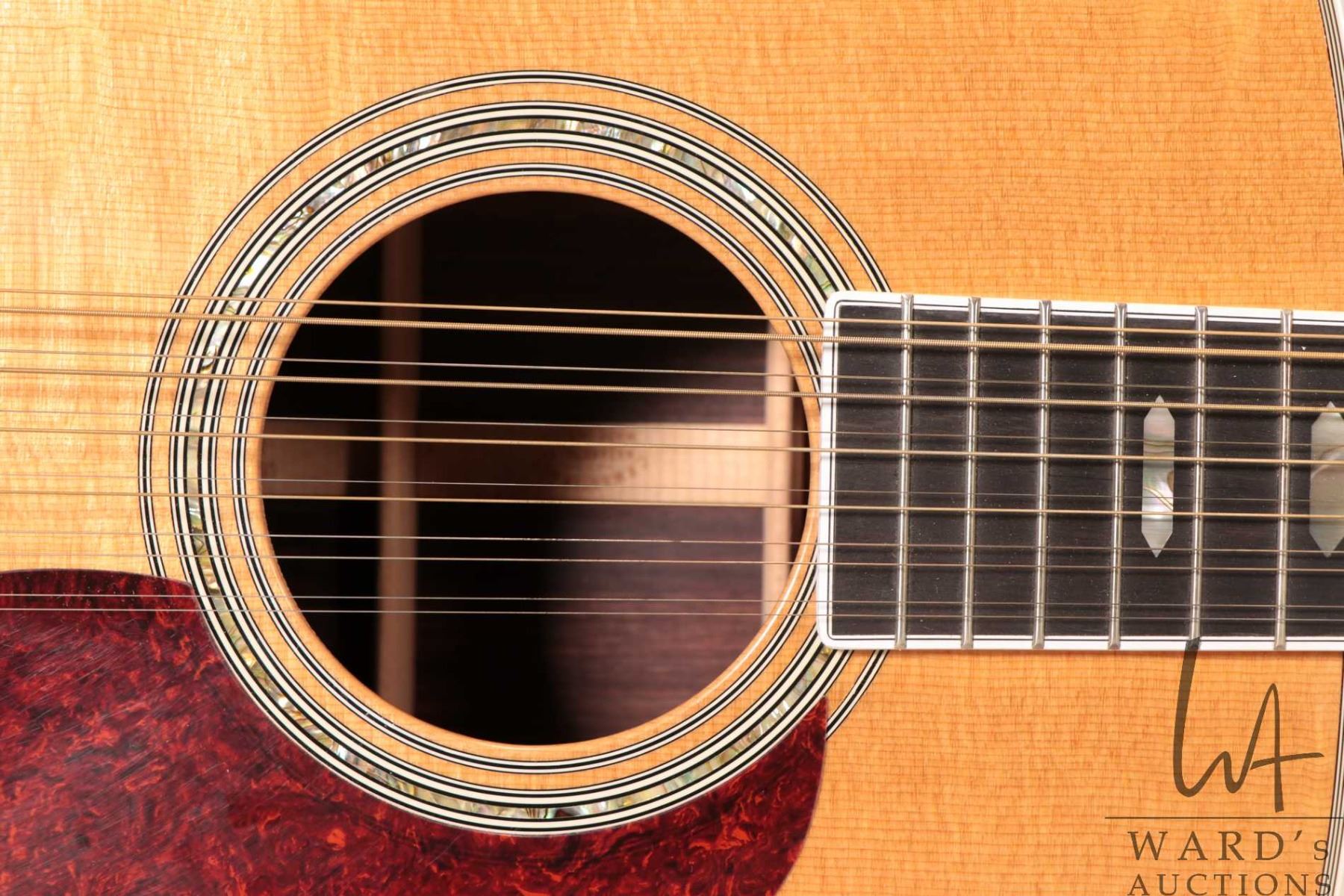 Martin custom 12 string guitar, serial no. 625472 dating to 1998, exotic hardwood body with maple body front, inlaid finger board and head. Not fitted with electric pick ups. Appears virtually unused with hanging tags attached.