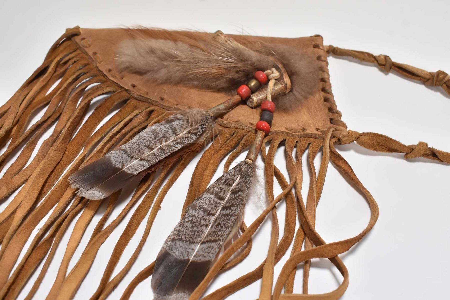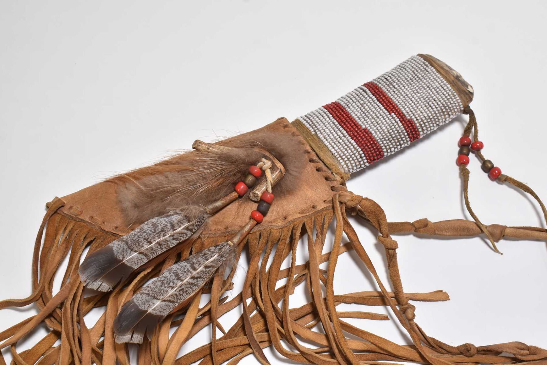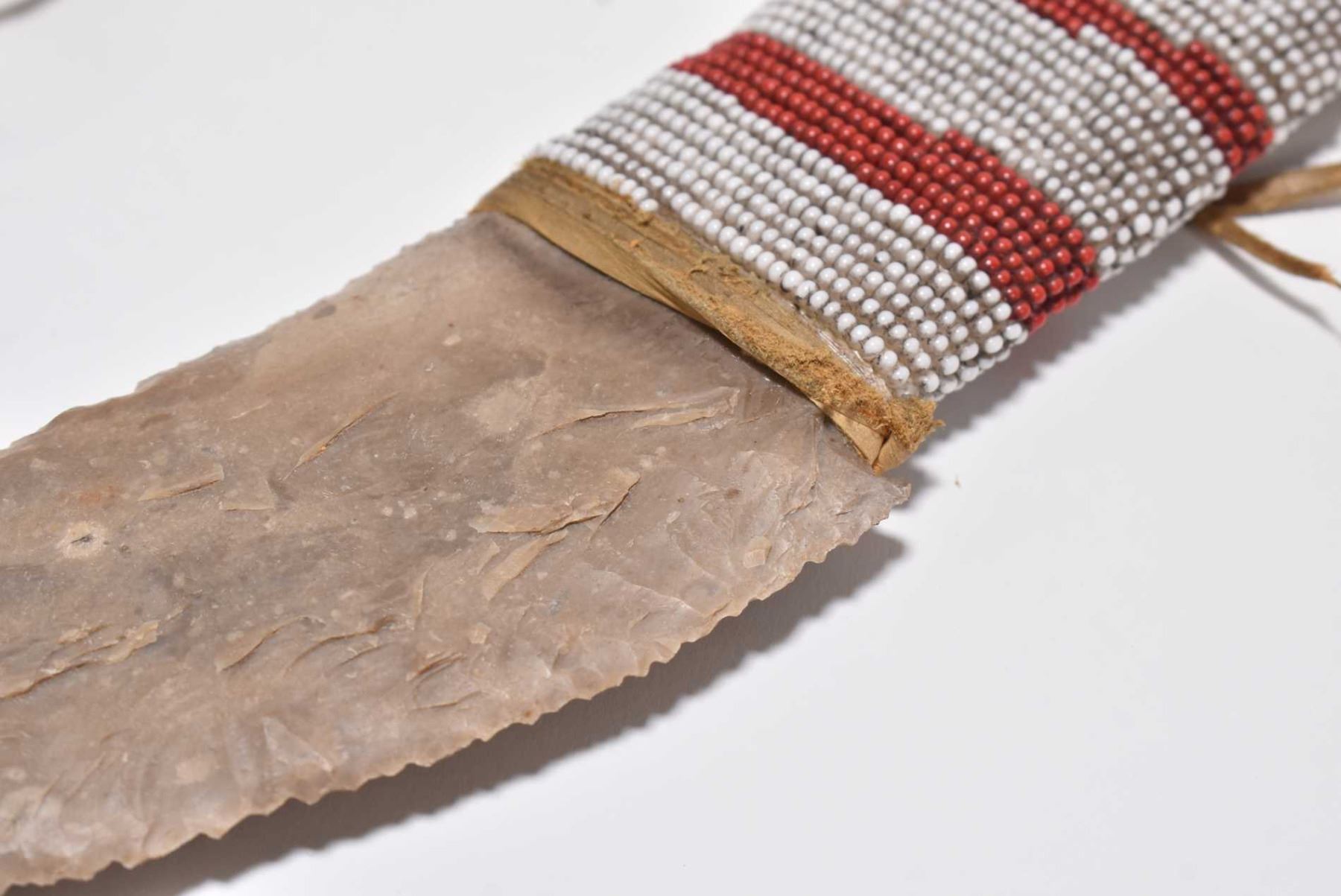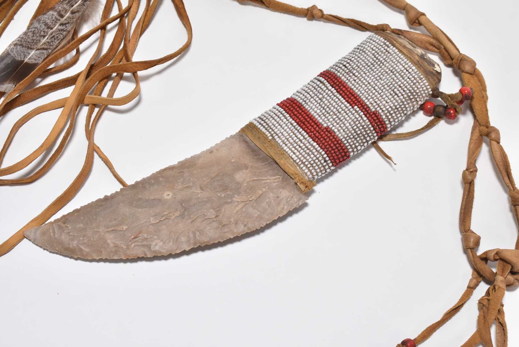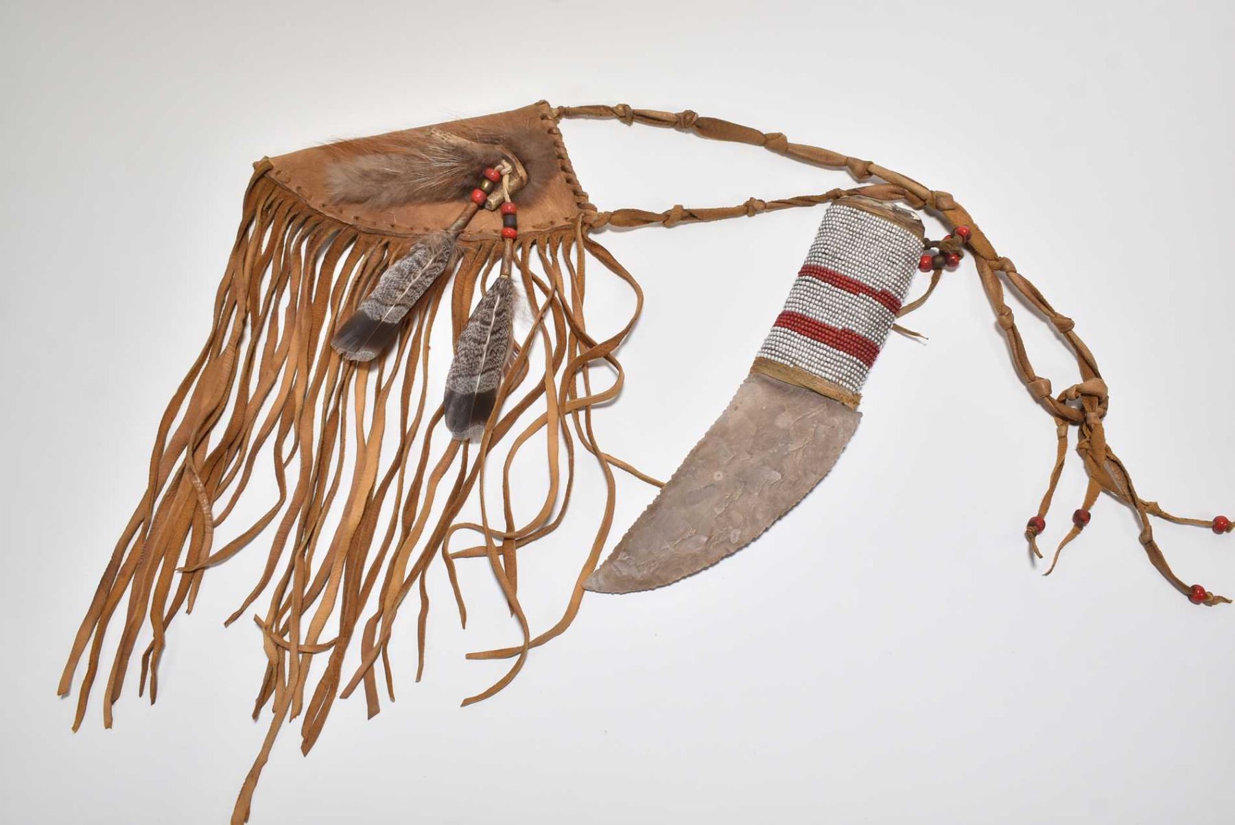 Master Hunter quality reproduction flint knife with sheath including beaver fur, elk-hide, trade, glass and brass beads, antler disc and grouse feathers in glass display