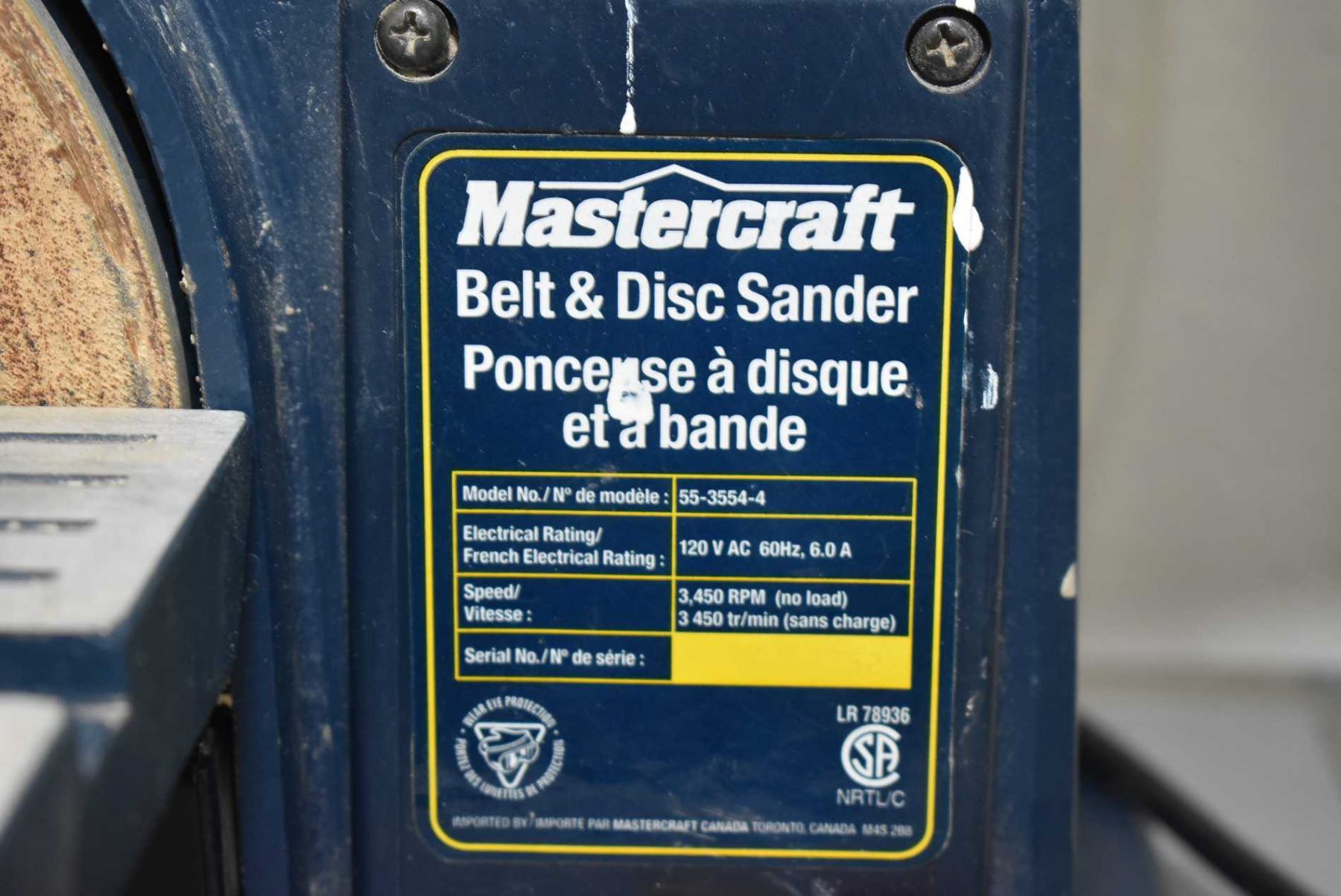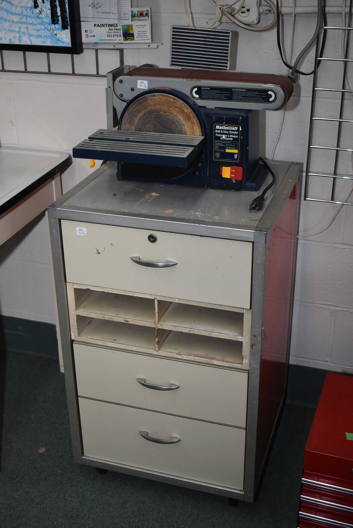 Mastercraft belt and disc sander and a three drawer workshop cabinet on castors