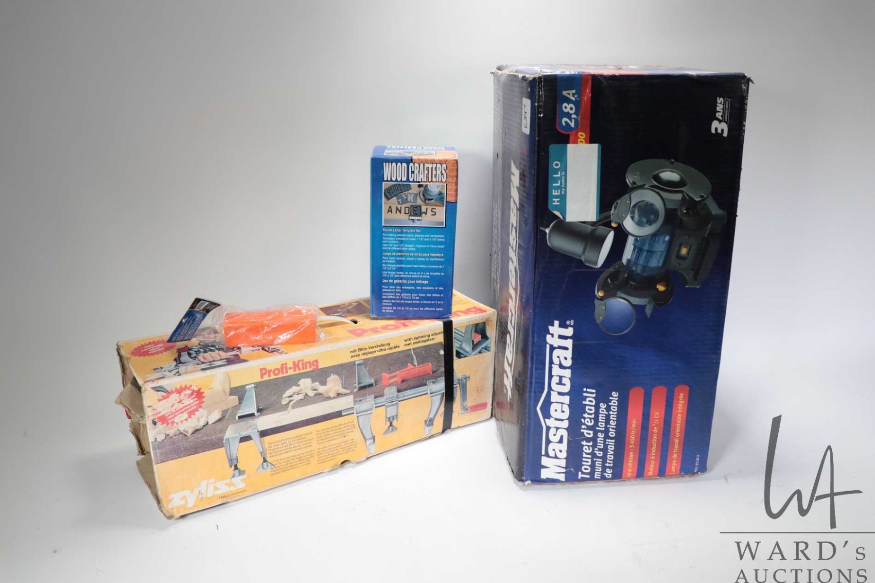 Mastercraft bench grinder w/ flexible working light, Profi-King portable vice, soft jaws and a Woodcrafters router letter template set