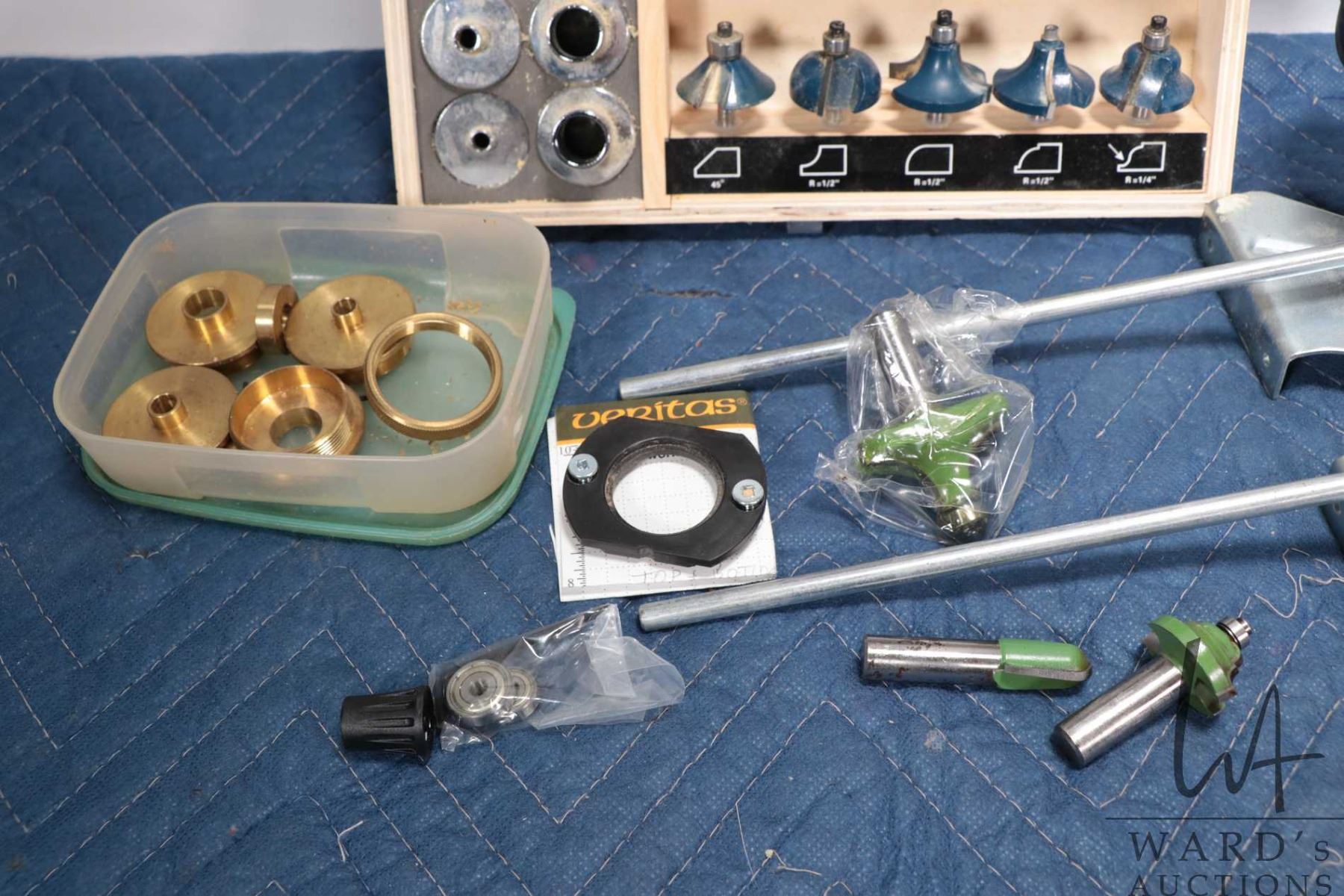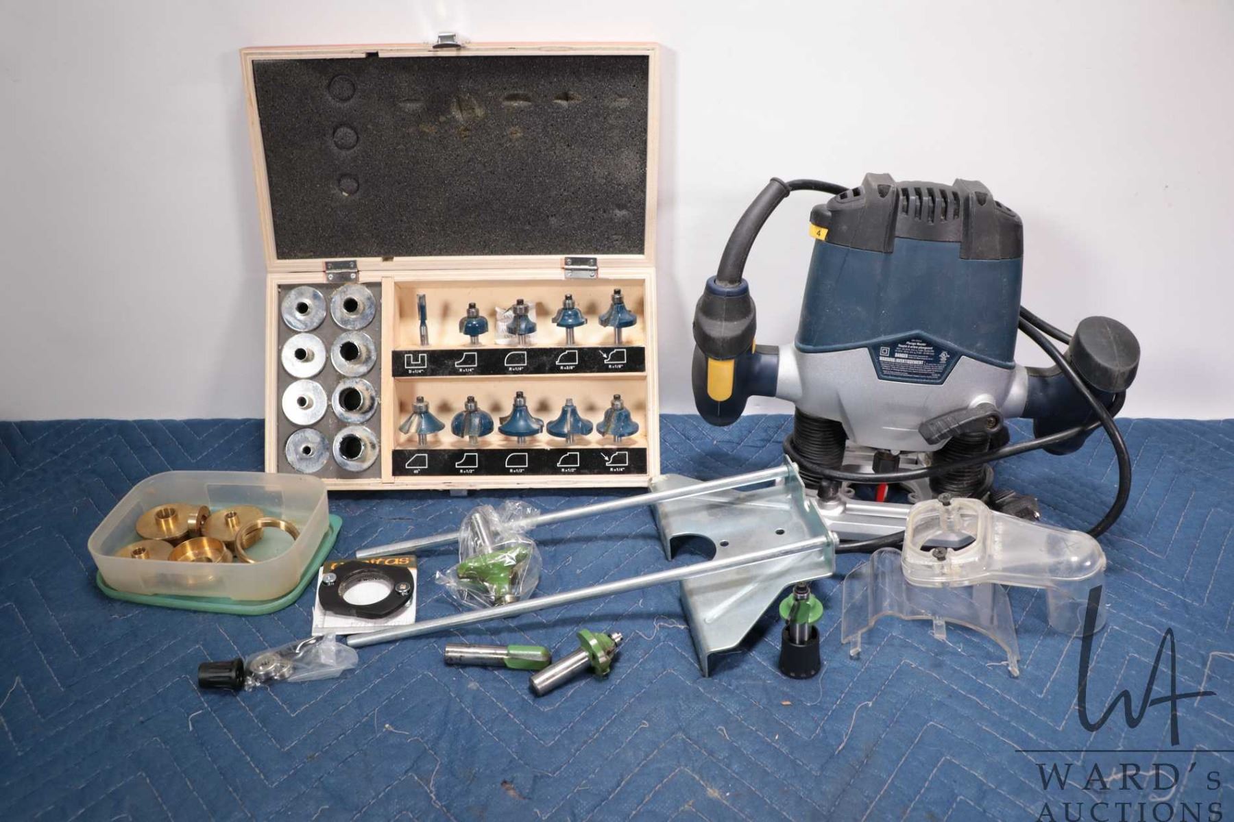 Mastercraft plunge router no. 054-7010, working at time of cataloguing and a selection Lee Valley router bits and bushings plus a set of Mastercraft bits and bushings