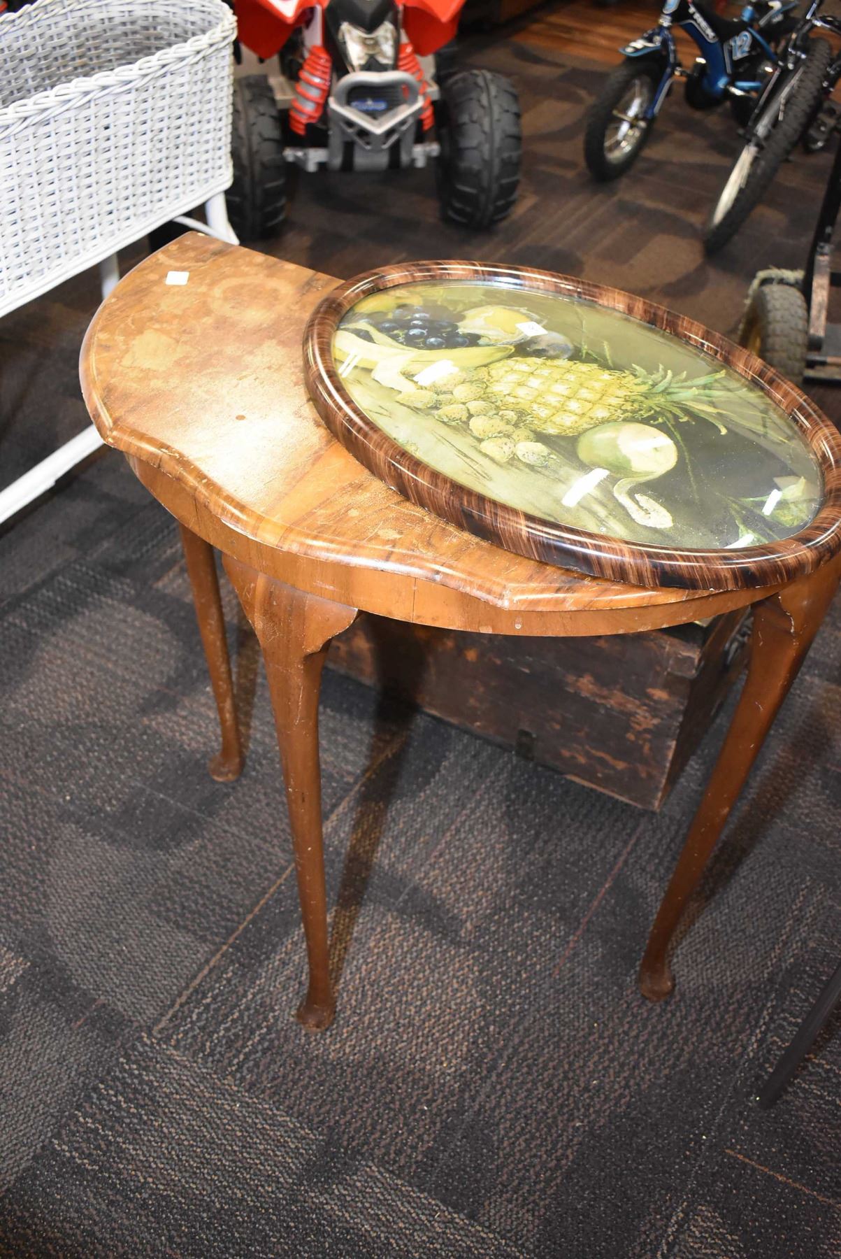 Matched grain English walnut back to the wall table and a convex glass picture frame with print