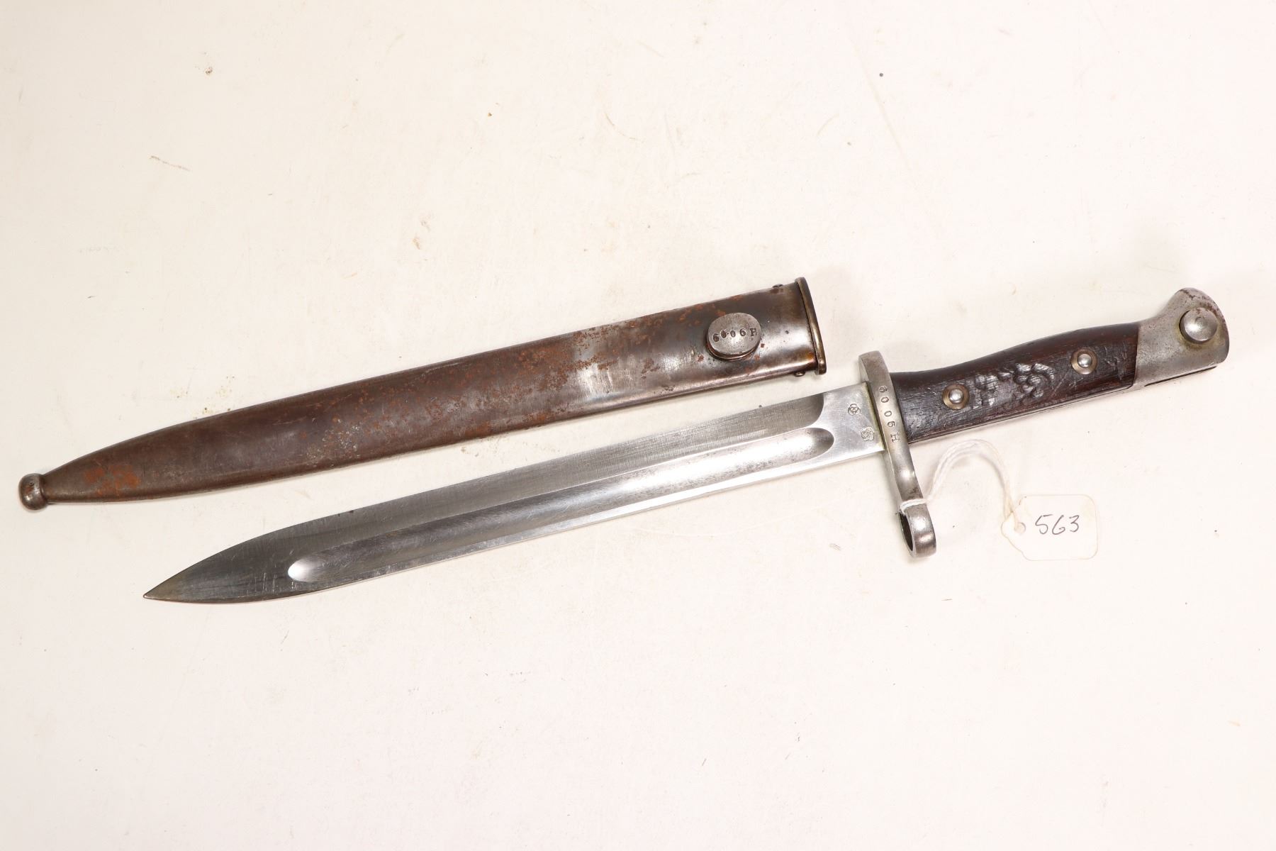 Mauser bayonet marked Weyersberg Kirschbeaum & Co. Solingen and scabbard, both with matching serial numbers.