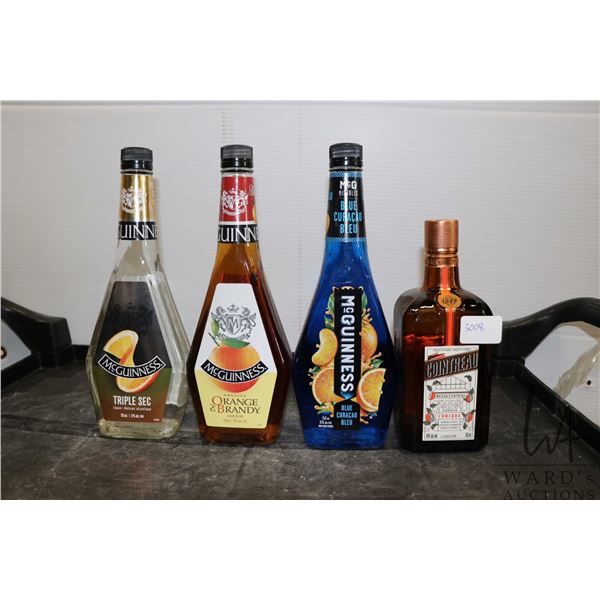 Four assorted bottles of liquor including one McGuiness Triple Sec 750ml / 22% ABV, one McGuiness Or