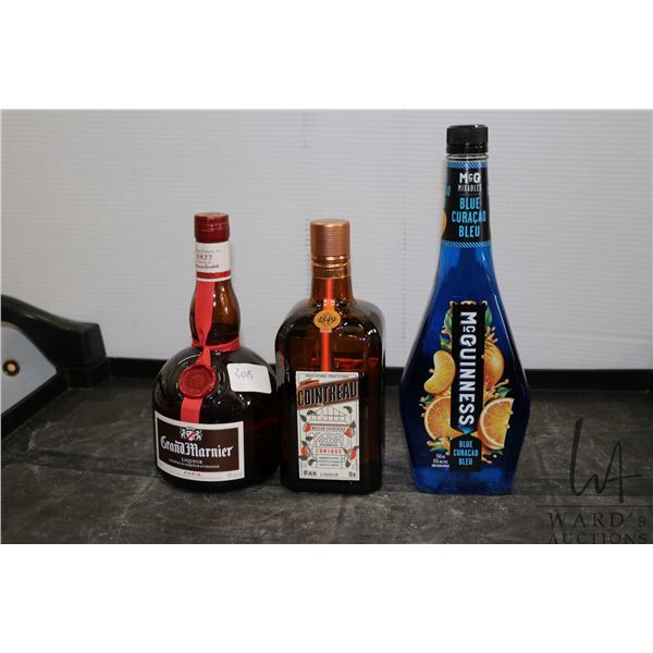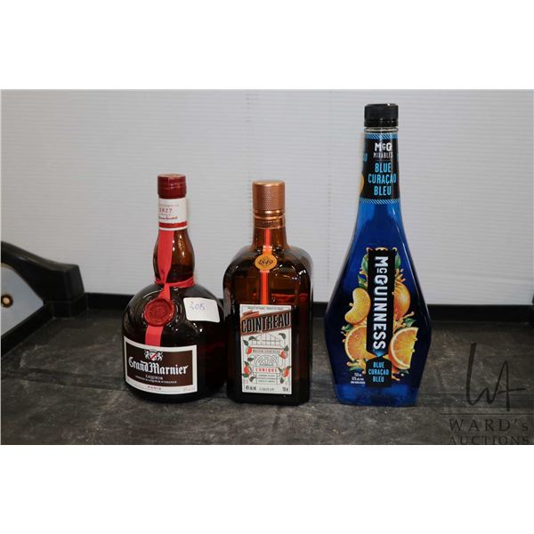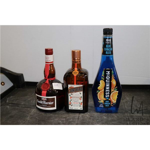 Three assorted bottles of liquor including one McGuiness Orange & Brandy 750ml / 35% ABV, one McGuiness Blue Curacao 750ml / 15% ABV, and one Co...