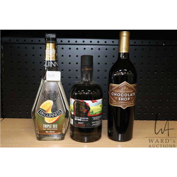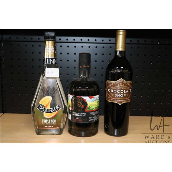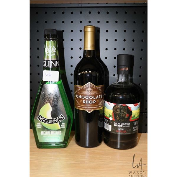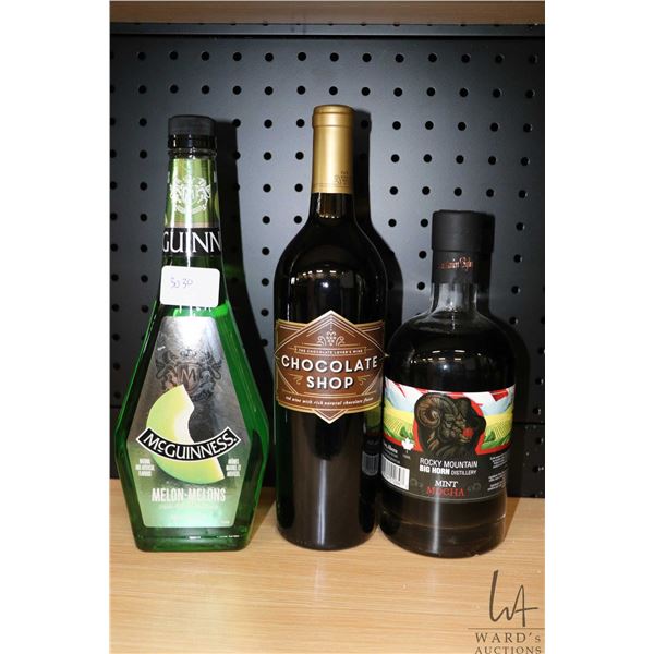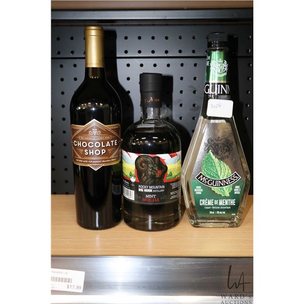 Three assorted bottles of liquor including two Rocky Mountain Big Horn Distillery Mint Mocha 750ml, and a McGuiness Apricot Brandy 750ml / 17% ABV No