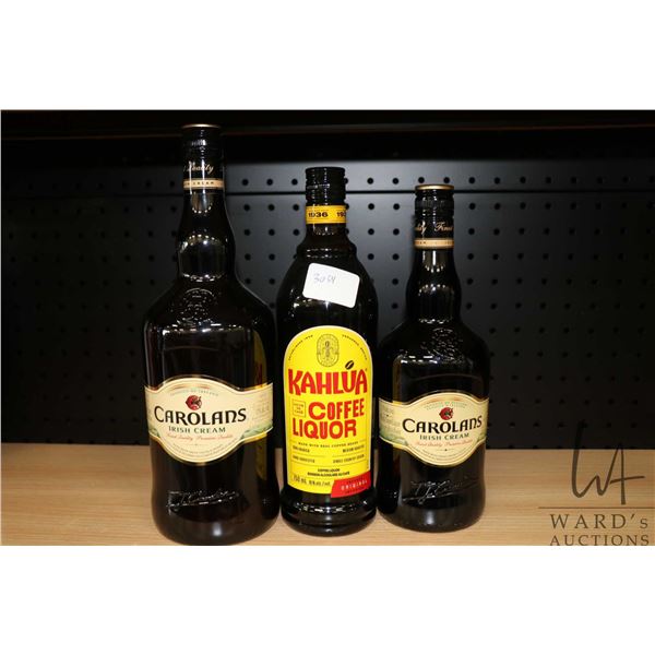 Three assorted bottles of liquor including one Carolans Irish Cream 1.0l / 17% ABV, one Carolans Irish Cream 750ml / 17% ABV, and one Kahlua Coffee Li