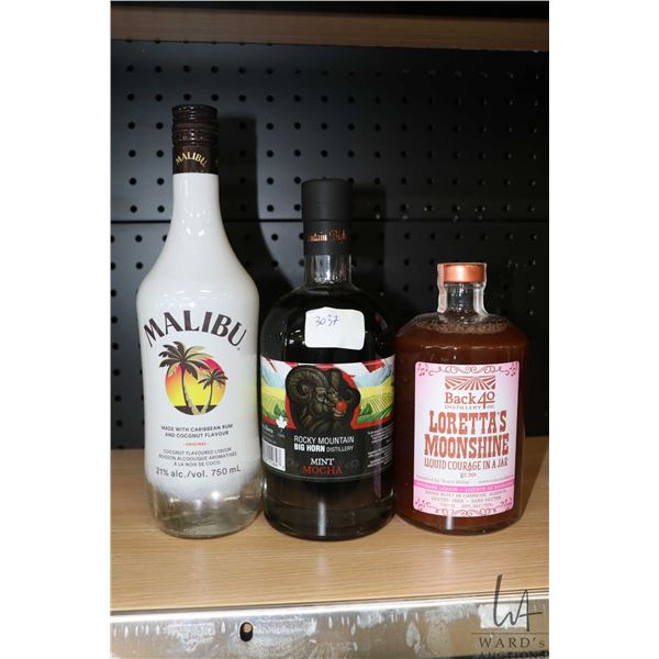 Three assorted bottles of liquor including one Malibu original 750ml / 21% ABV, one Rocky Mountain Big Horn Distillery Mint Mocha 750ml / 30% ABV, and