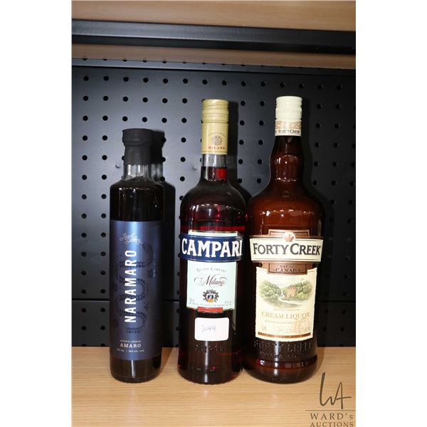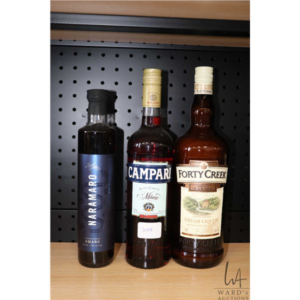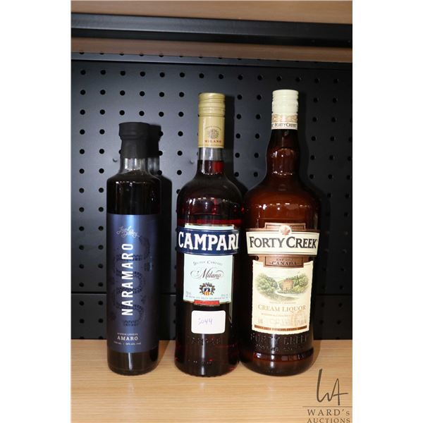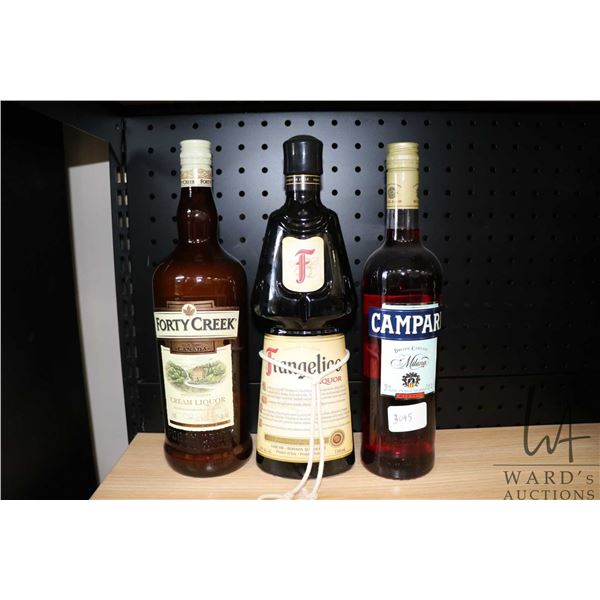 Three assorted bottles of liquor including one Frangelico Liquor 750ml / 20% ABV, one Campari Milano Bitter 750ml / 25% ABV, and one Forty Creek Cream