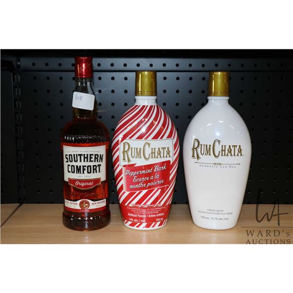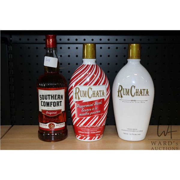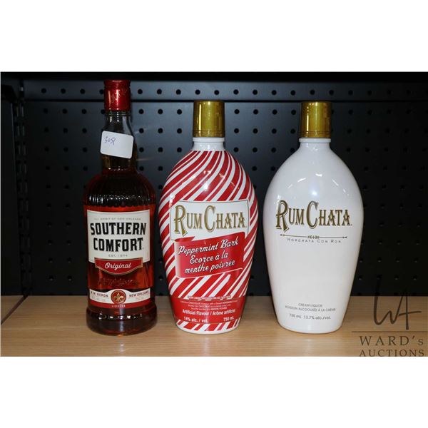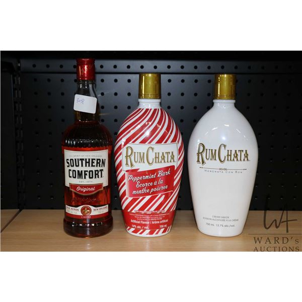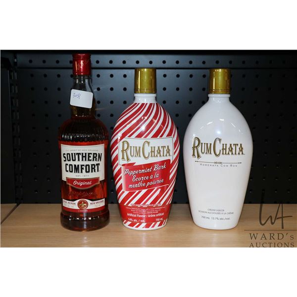 Three assorted bottles of liquor including one Southern Comfort Original 750ml / 35% ABV, one Rum Chata Peppermint Bark 750ml / 14% ABV, and one Rum C