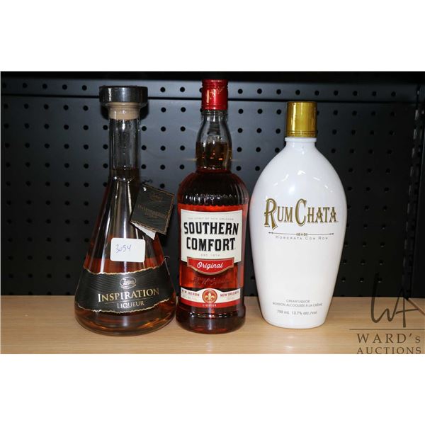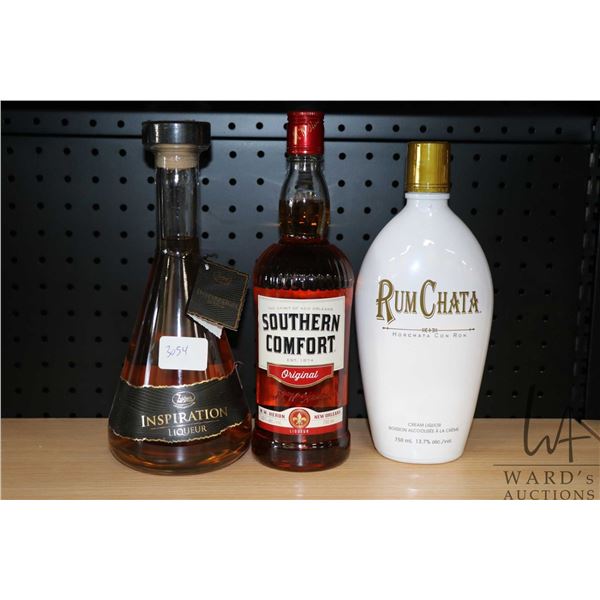 Three assorted bottles of liquor including one Southern Comfort Original 750ml / 35% ABV, one Zuidam Distillers Inspiration Liqueur, and one Rum Chata