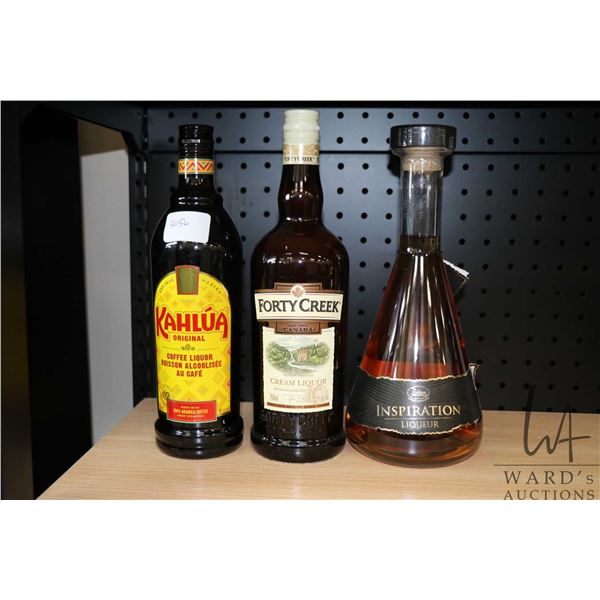 Three assorted bottles of liquor including one Forty Creek Cream Liquor 750ml / 17% ABV, one Zuidam Distillers Inspiration Liqueur and one Kahlua Orig