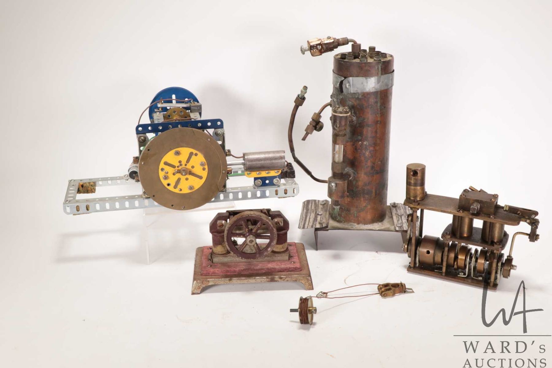 Meccano crankless piston engine, vintage Weeden toy motor no. 101 electro-magnetic generator, a two cylinder steam engine and a copper boiler, 12" in height