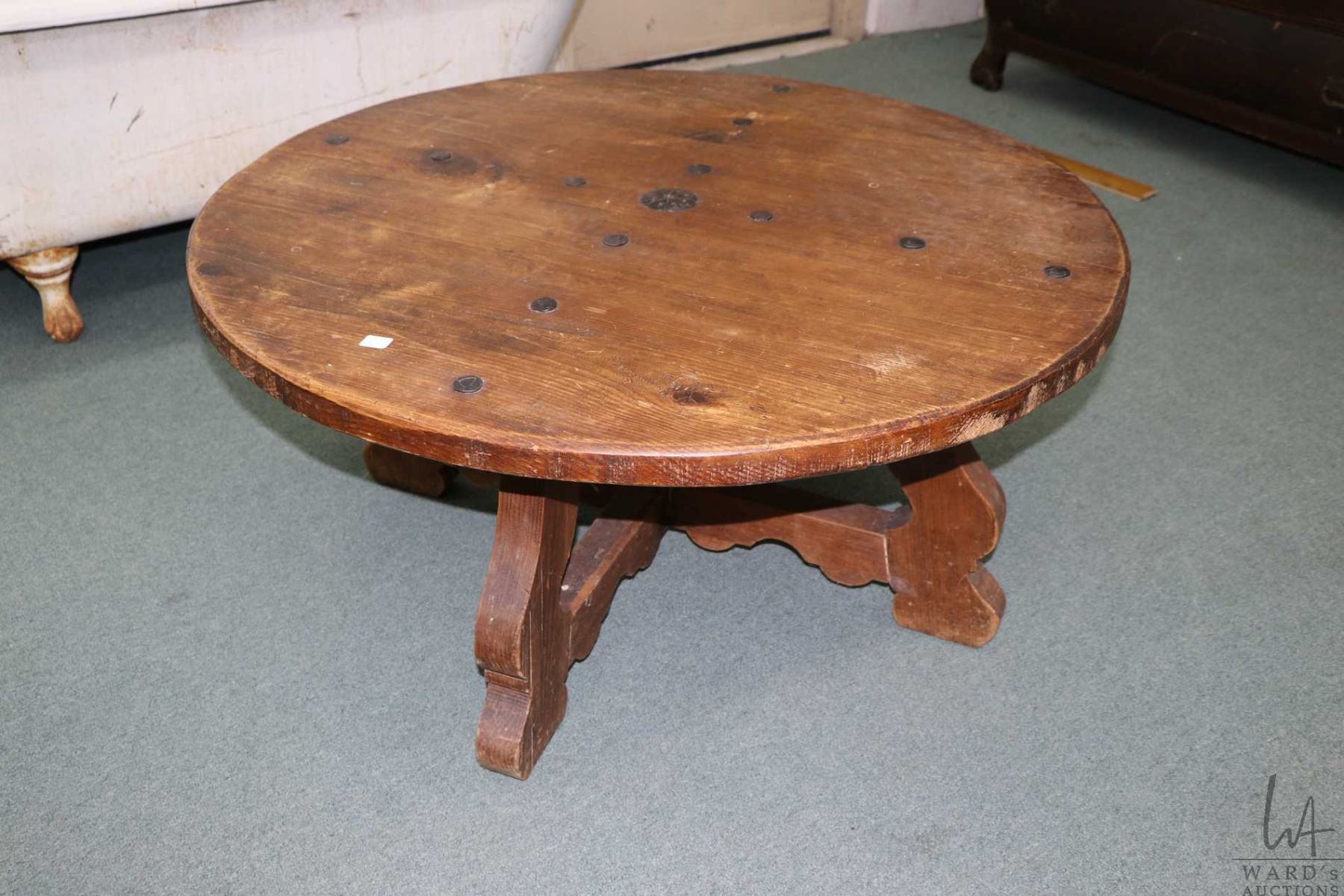 Medieval influenced 39" diameter round coffee table with hand hammered decoration