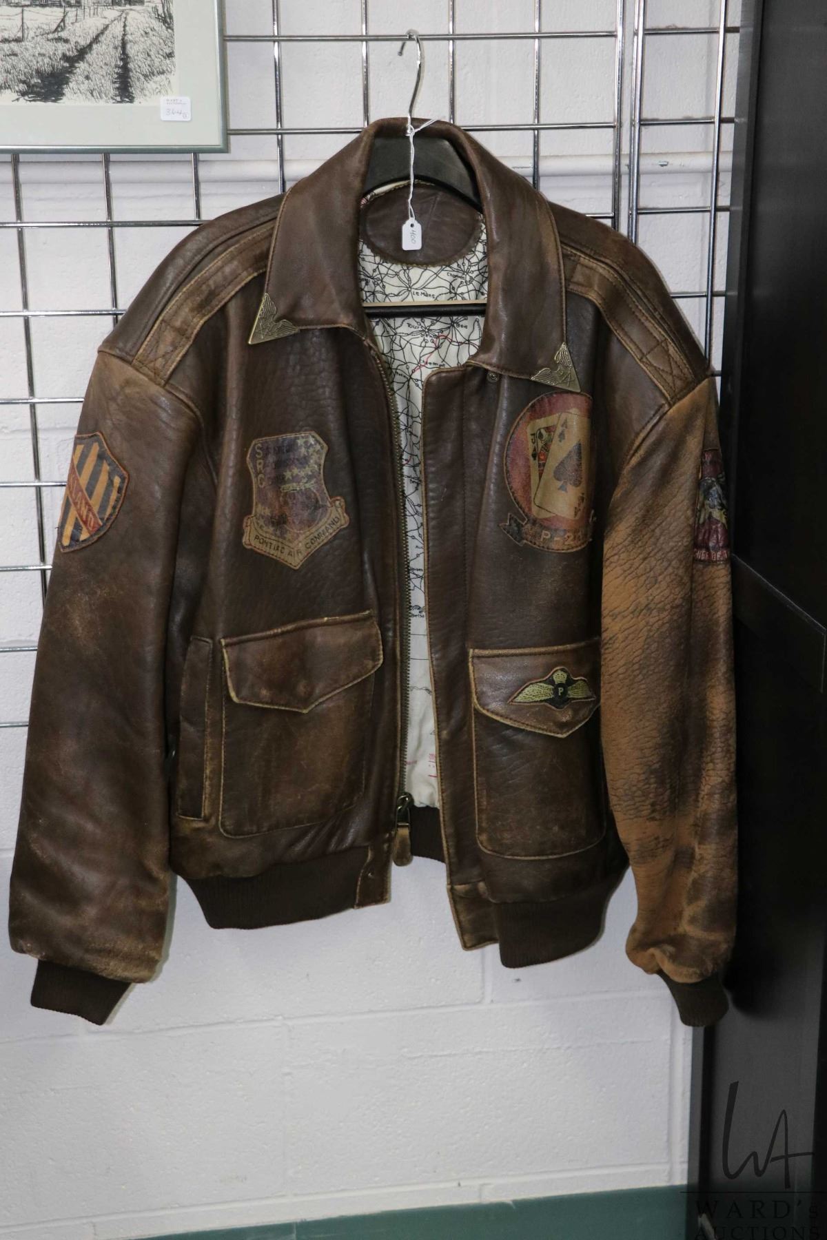Men's large leather WWII replica bomber jacket with French map lining of "Coastal Defense Area- Souther Boundary to Zone Interdite Area Boundary Between Occupied & Non-Occupied France"