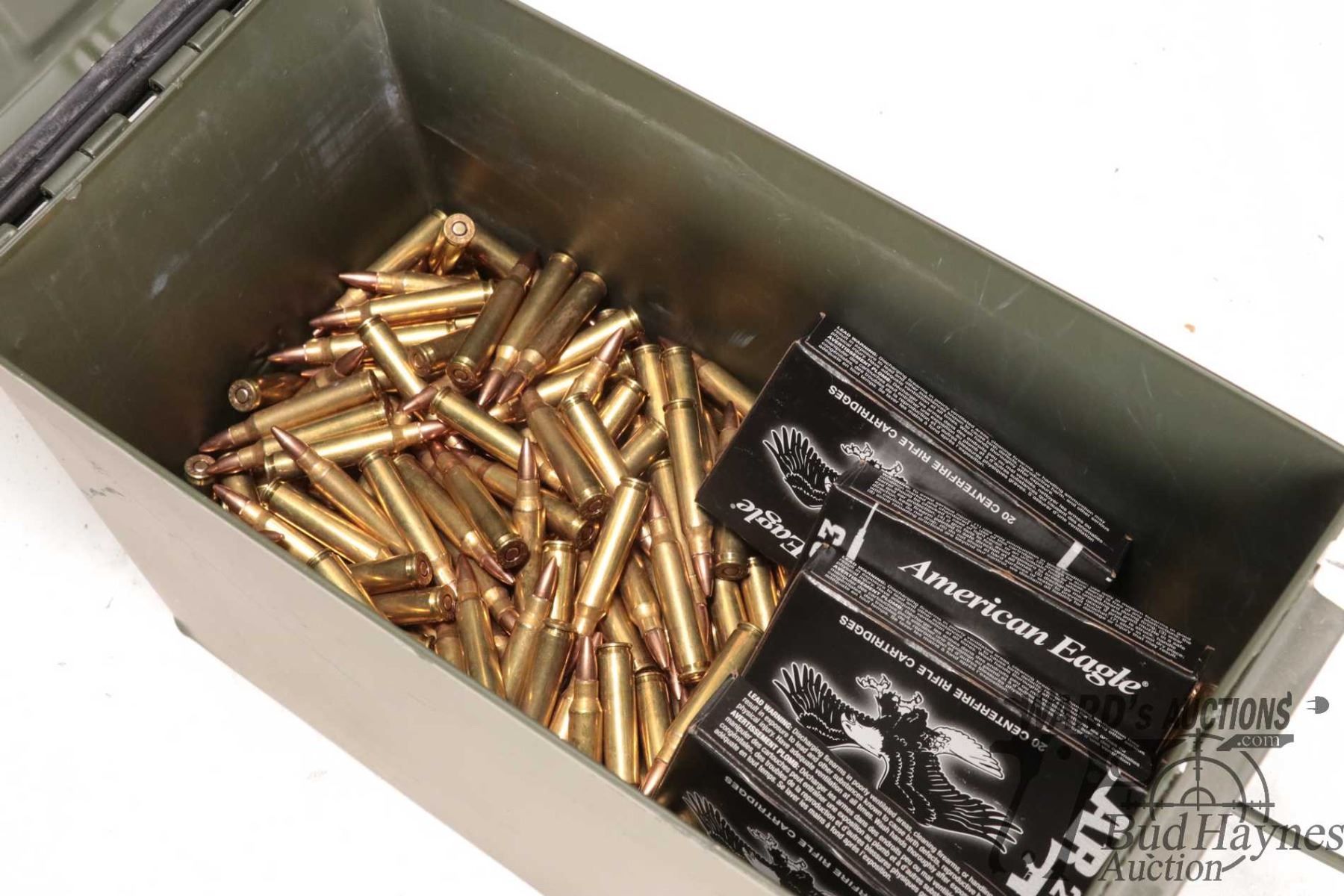 Metal ammo box w/ 458 rounds of .223 rem factory Metal ammo box w/ 458 rounds of .223 rem factory loads and four full 20 count boxes of American Eagle .223 rem 55 gr fmj