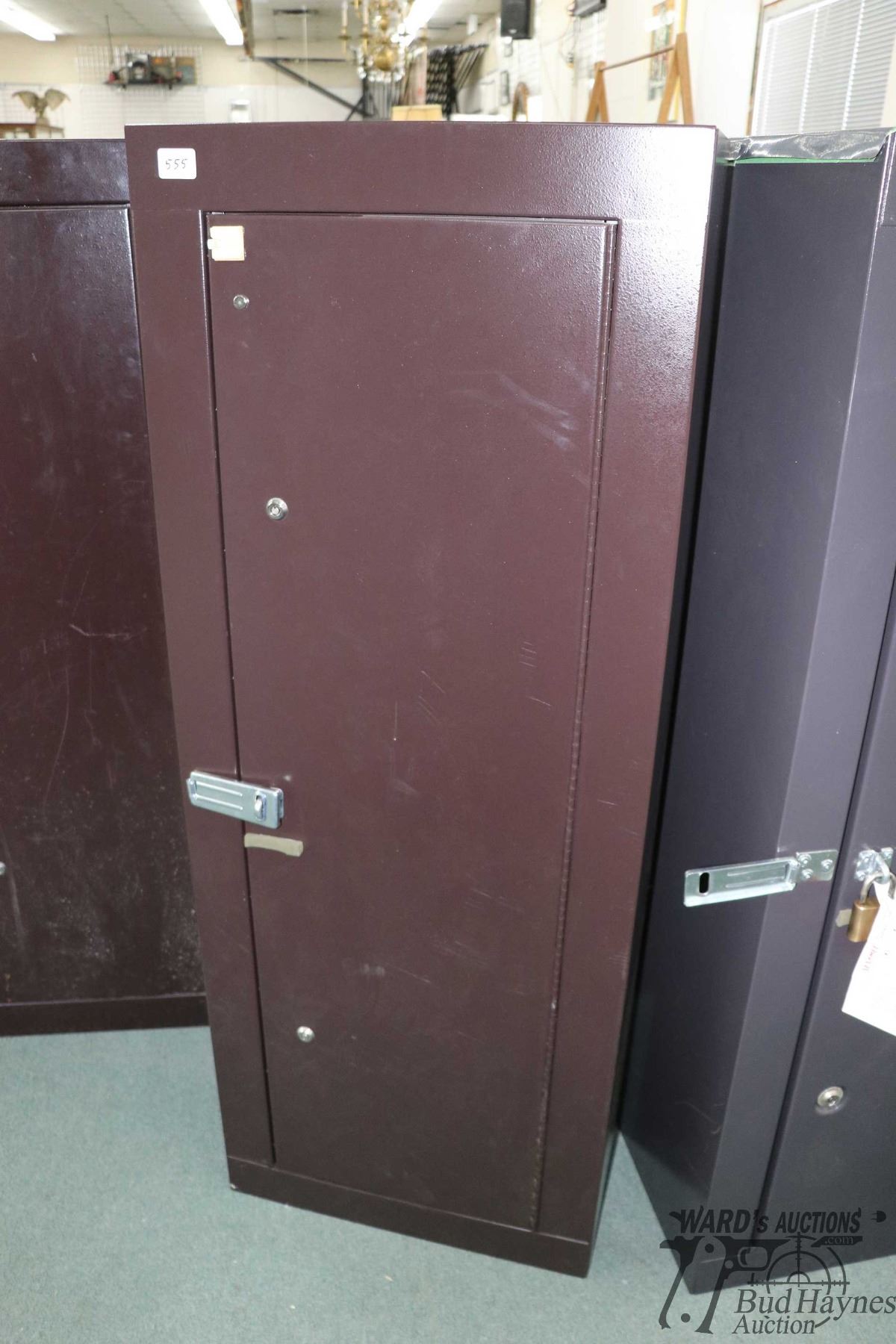 Metal gun locker with spaces for eight long guns, measures 55" H X 21" W X 10" D, locked and has no