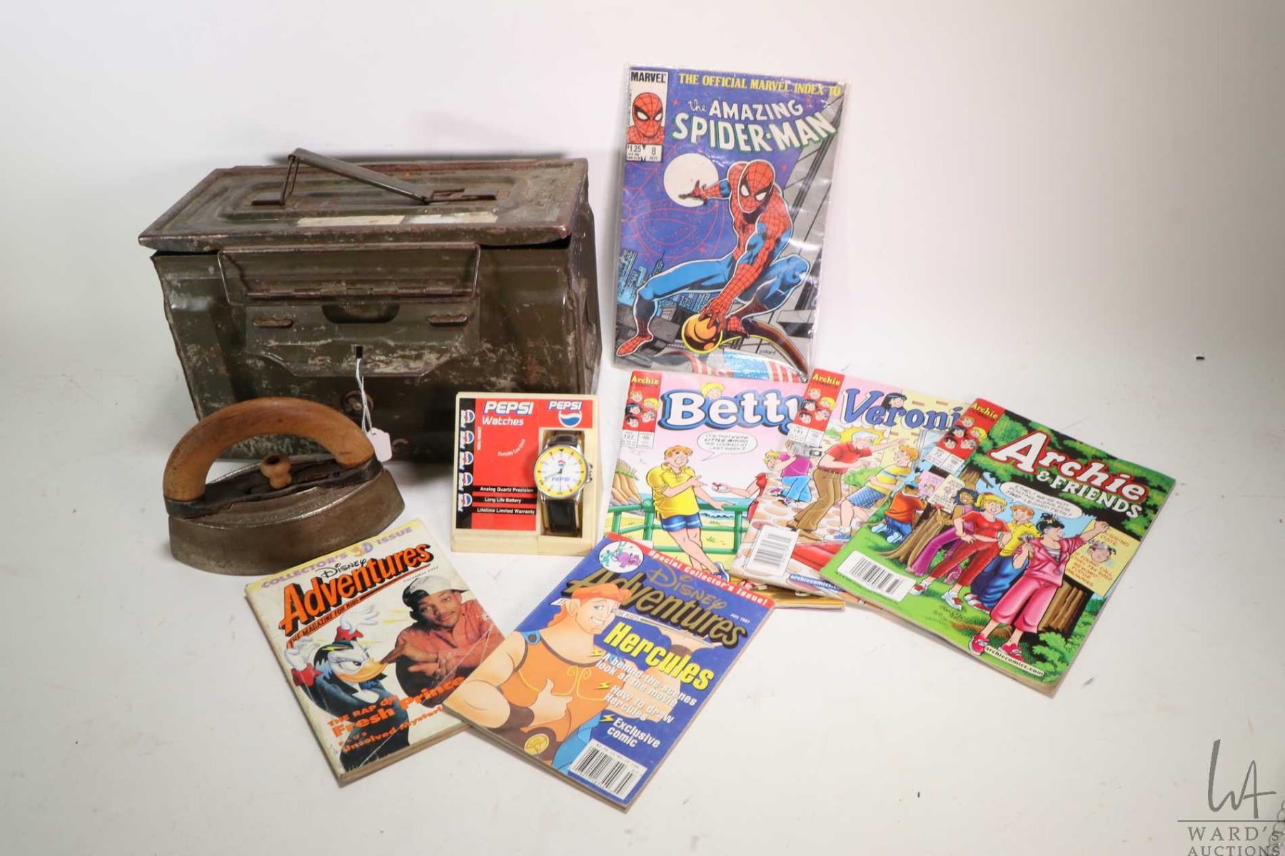 Metal milk bottle rack containing twelve vintage glass milk bottles, a Paymaster cheque writer, metal ammo tin, a selection of comic books including Archie, Spiderman etc, a sadiron with handle and a vintage Walmart Pepsi watch
