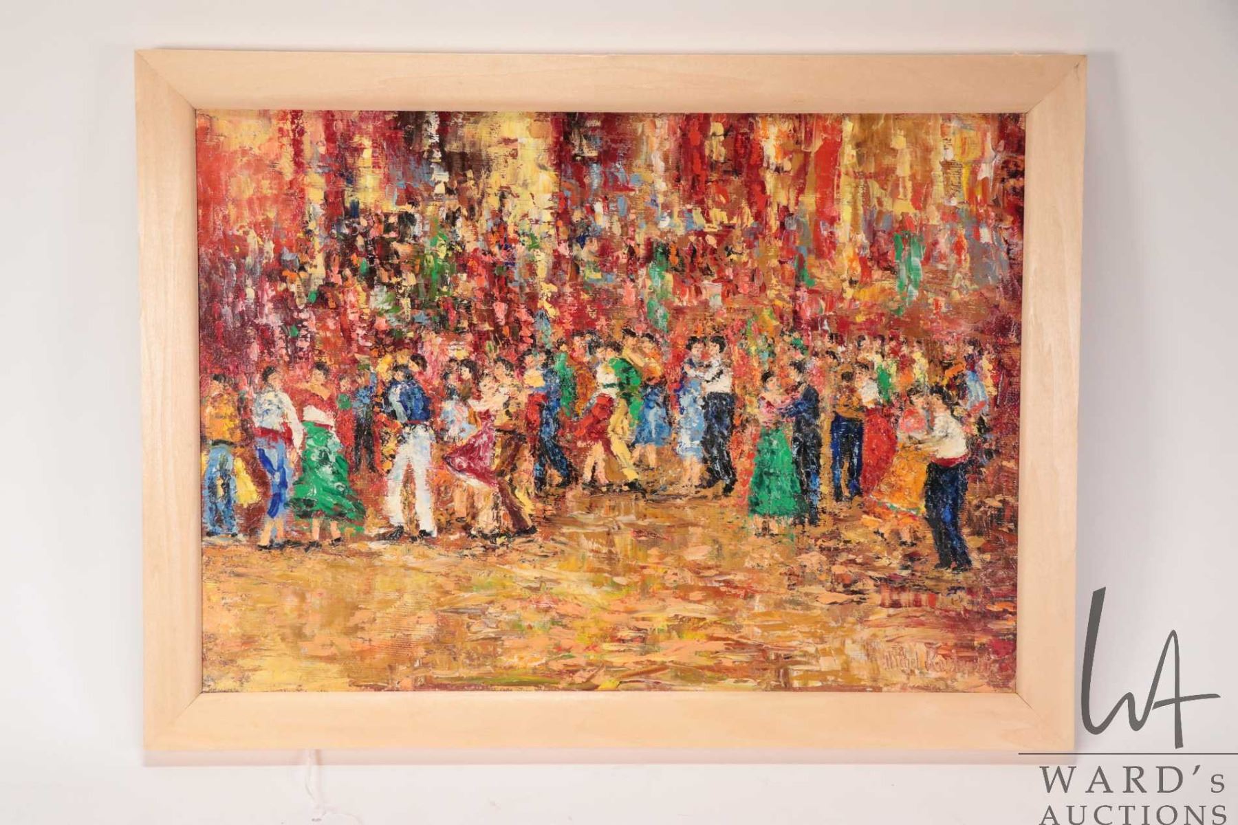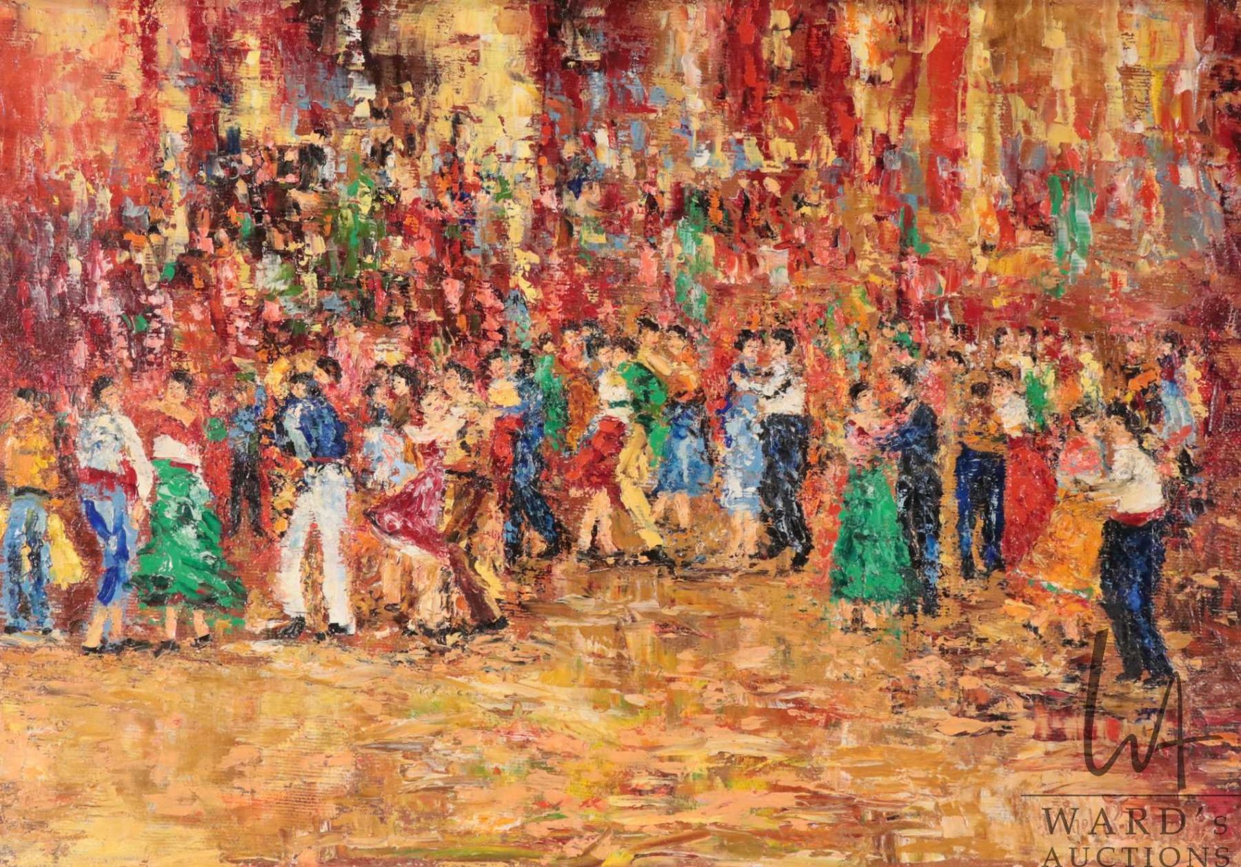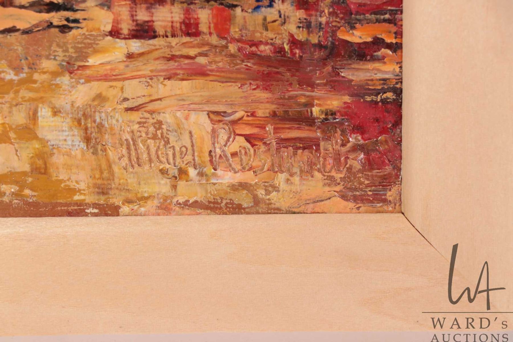 Michel Rostand, framed oil on canvas painting labeled on verso "Danse Champetre", 10" X 14"