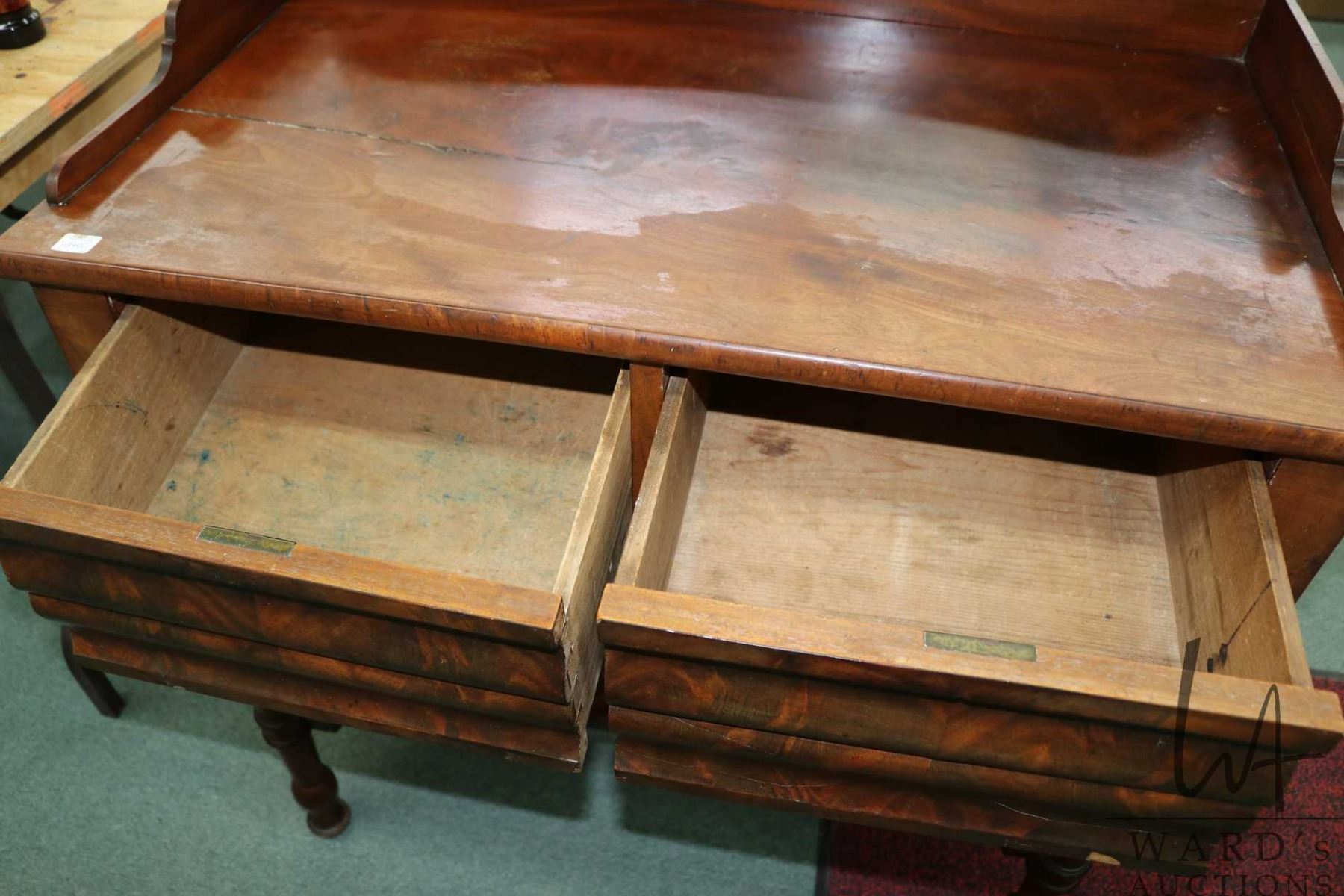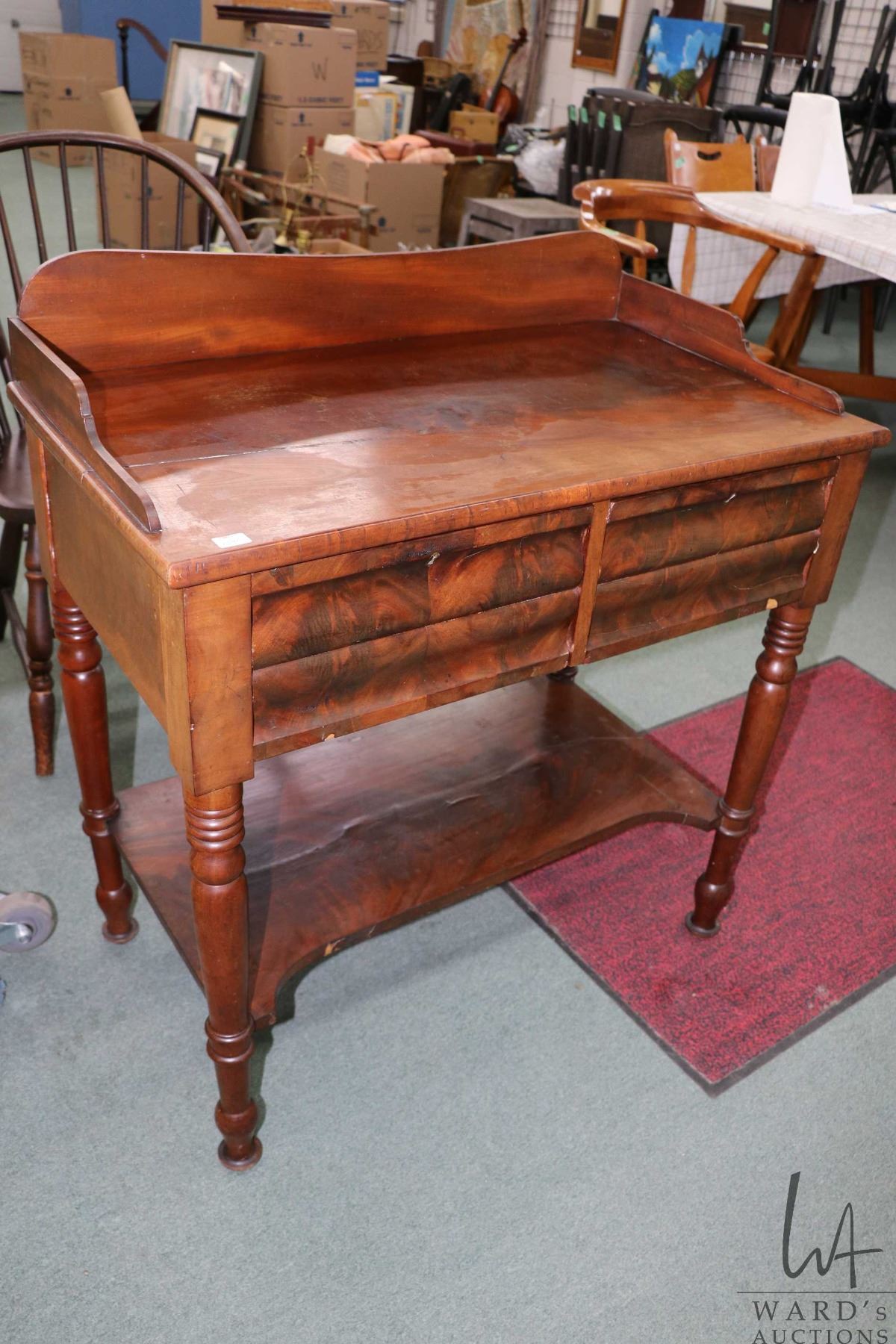 Mid 1800's two drawer mahogany washstand with low backboard and turned supports, 36" X 33" X 18"