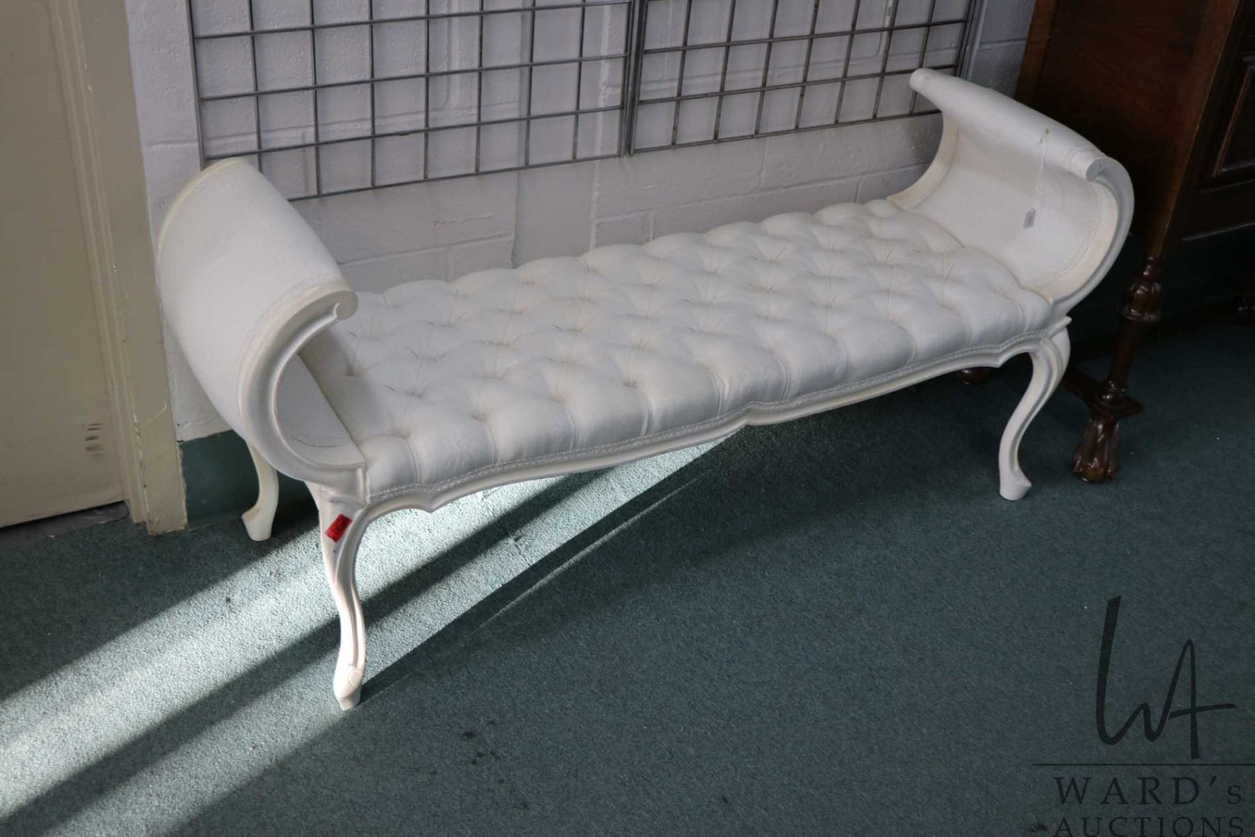 Mid 20th century French sleigh style button tufted Damask upholstered bed end bench on cabriole supports, 55' in width