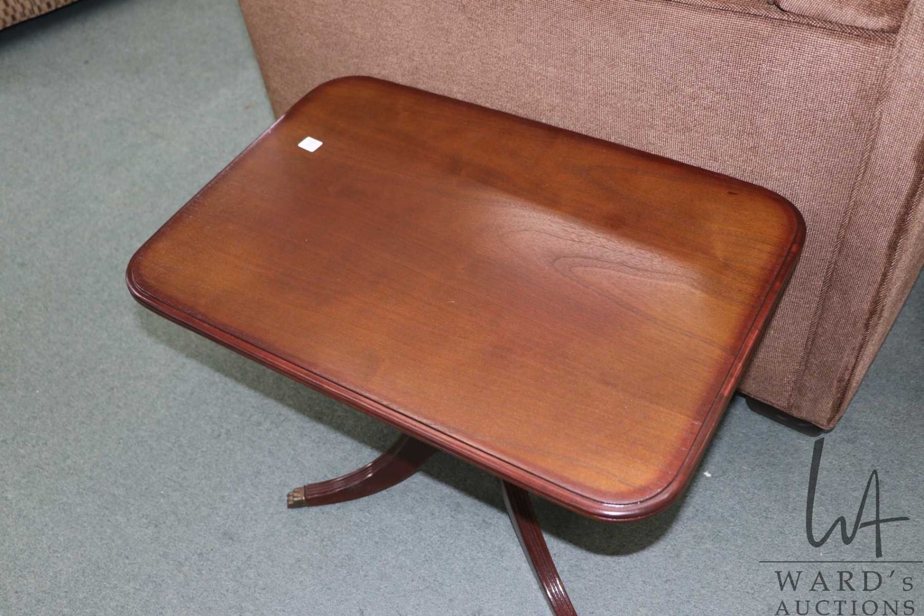 Mid 20th century, Regency style walnut coffee table with center pedestal with brass capped claw feet 19" H X 25" X 17"