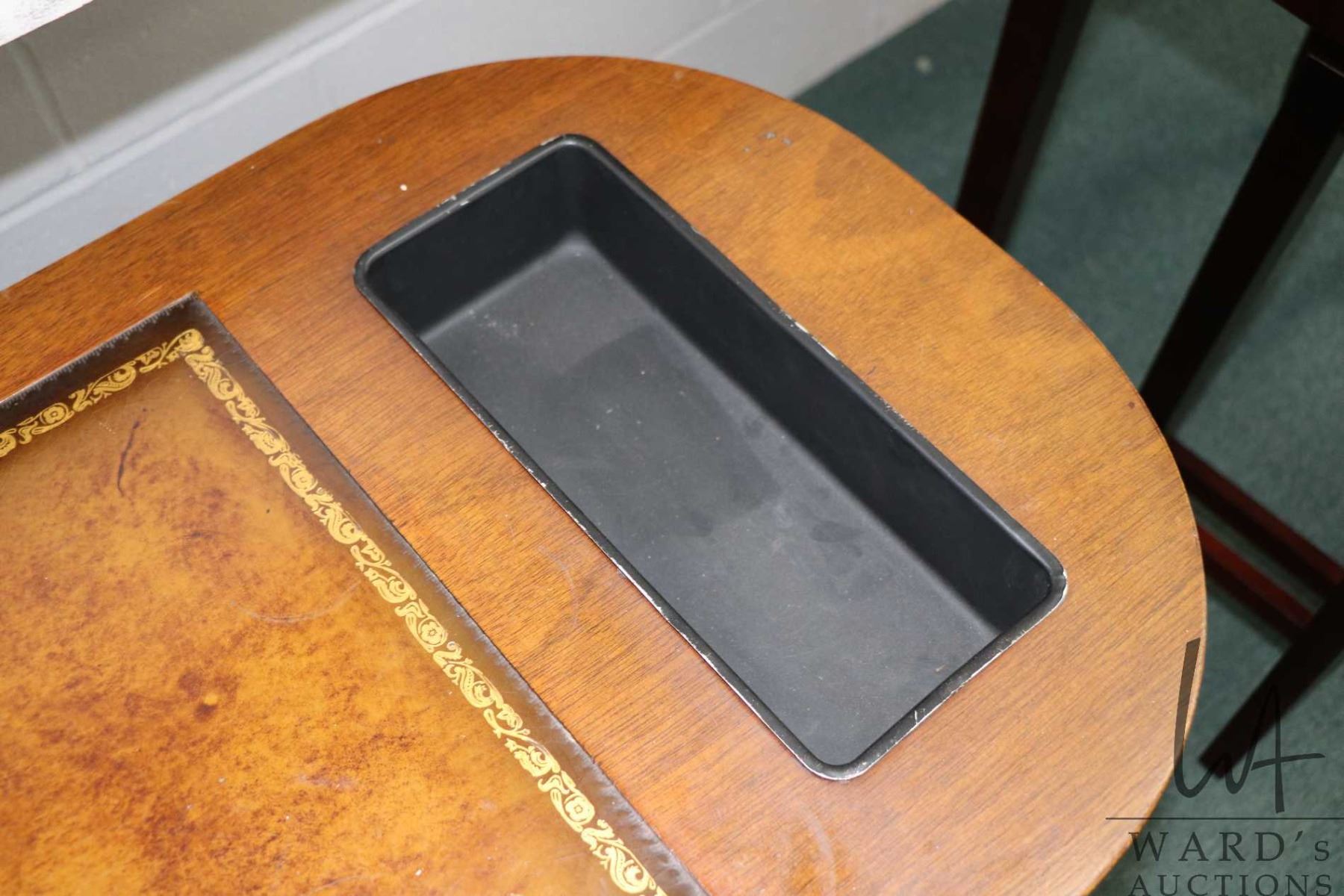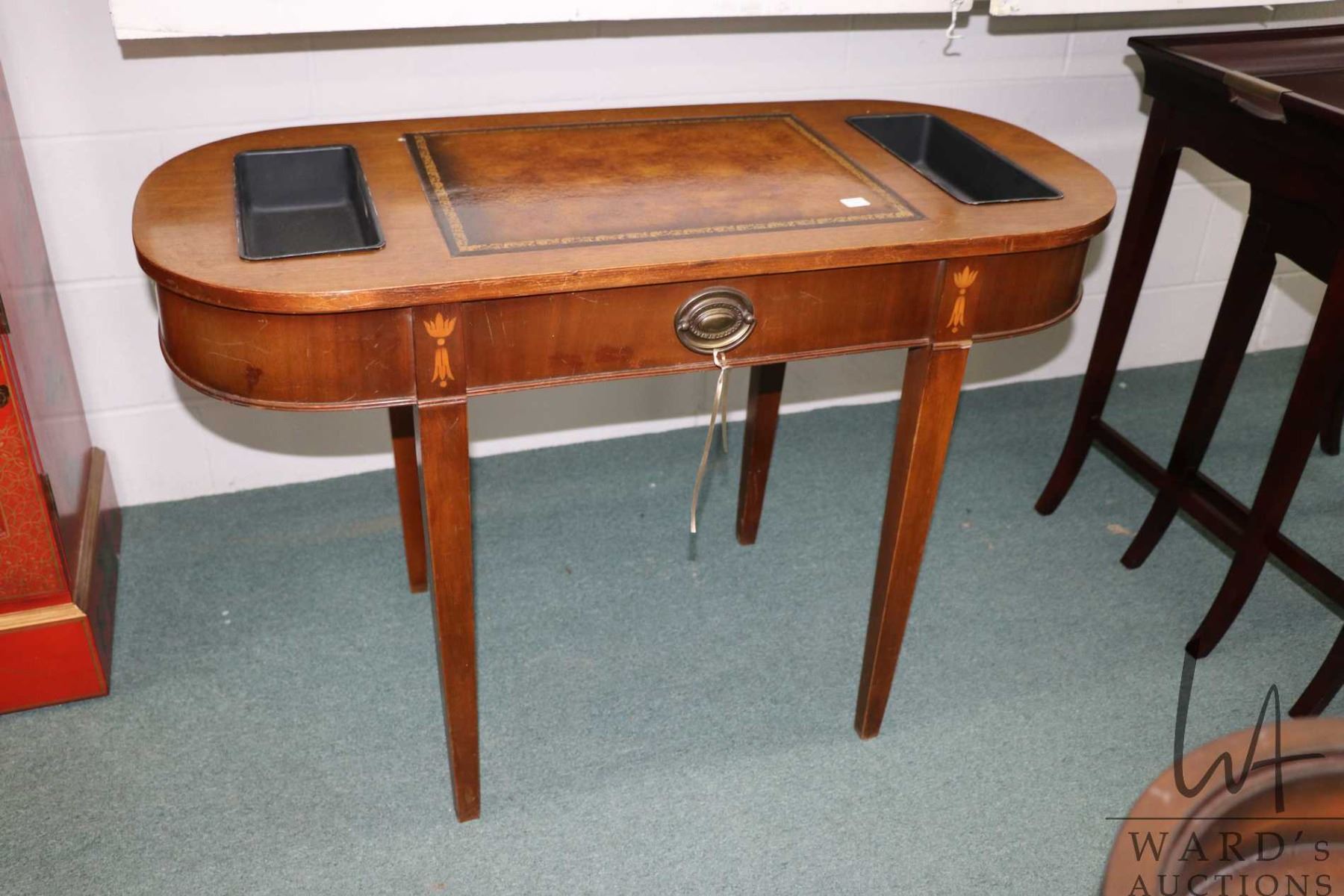 Mid 20th century, antique style mahogany console with leather inset center section and two sunken metal plant trays, 26" H X 40" W X 18" D
