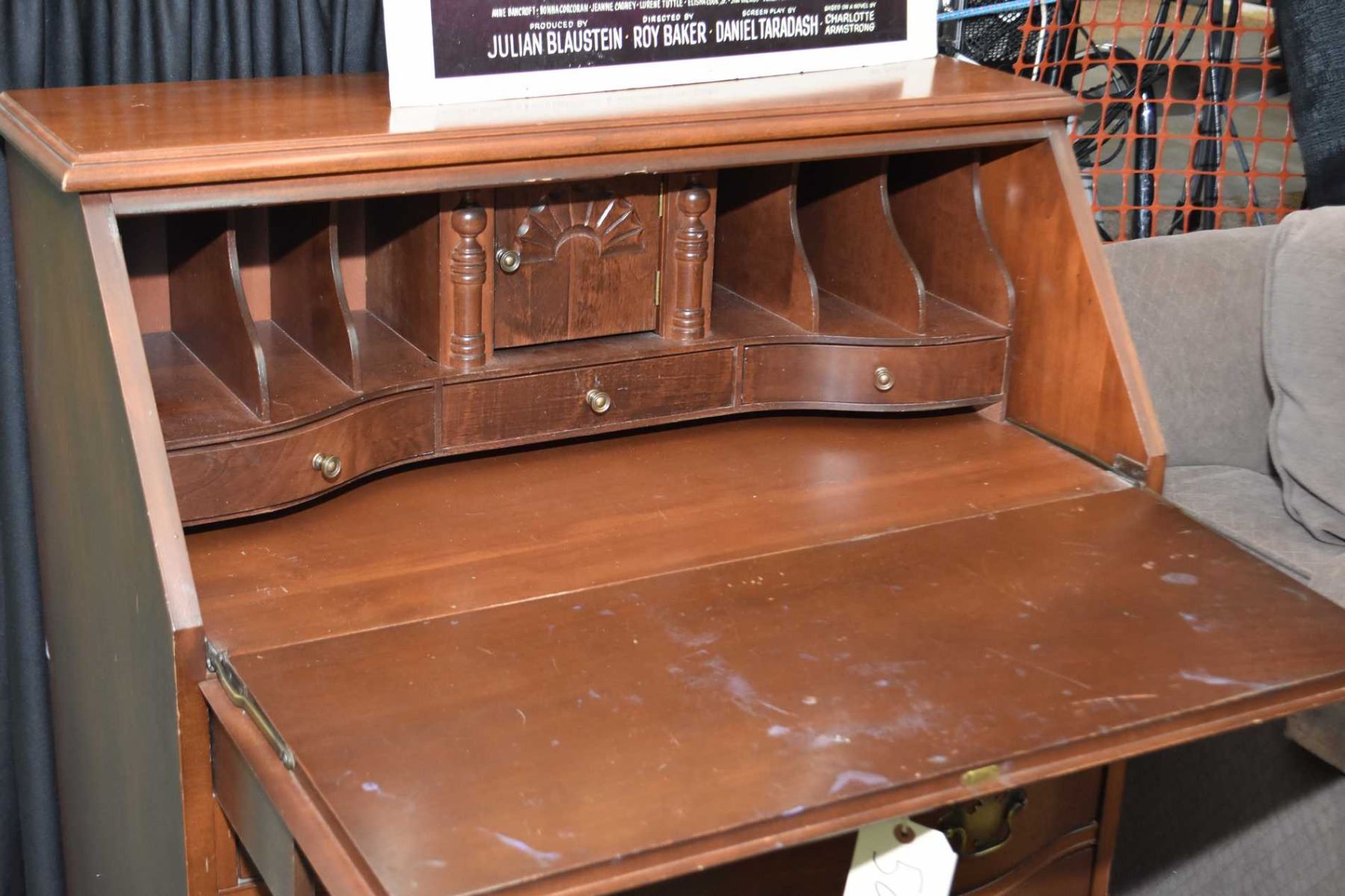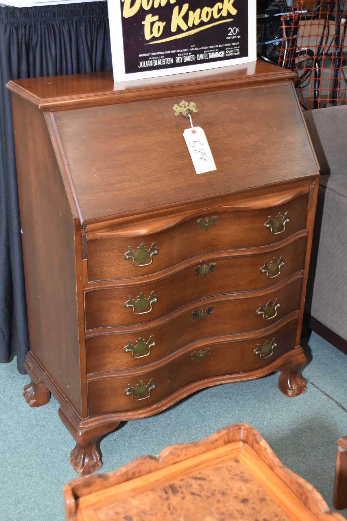 Mid 20th century mahogany drop front bureau with four serpentine drawers, fitted interior and ball and claw feet