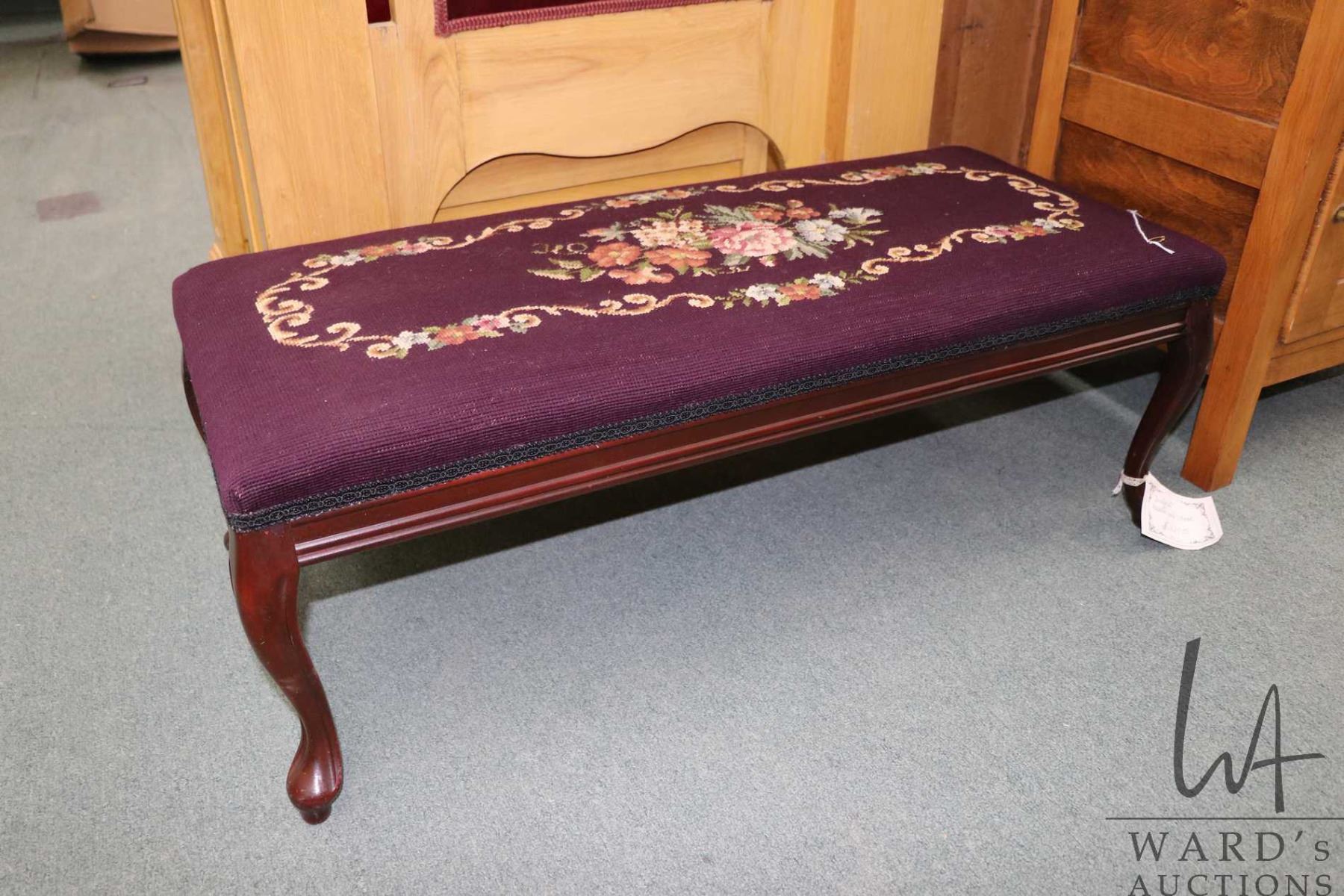 Mid 20th century needlepoint upholsterd foot stool with cabriole supports, 13" H X 36" X 16"