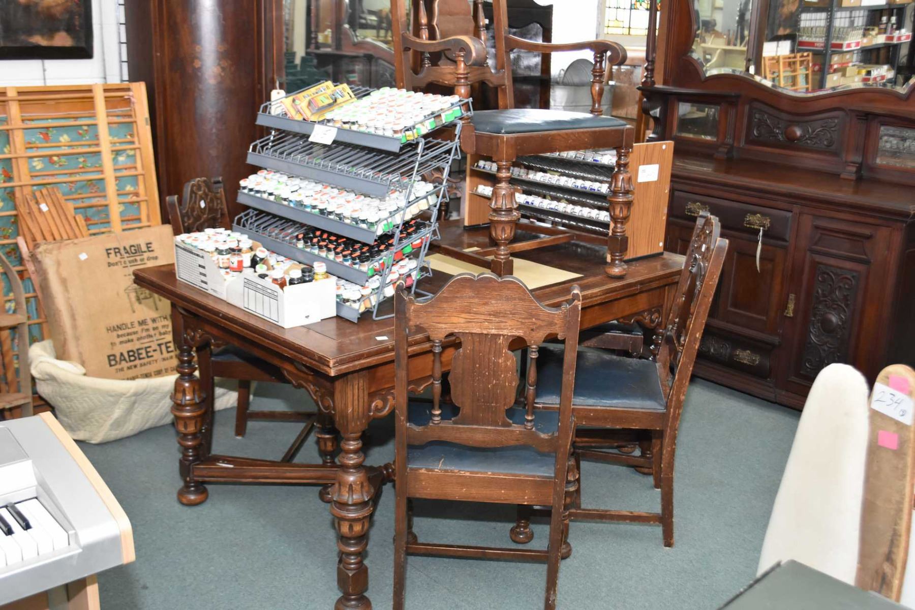 Mid 20th century refractory style oak draw leaf dining table with six dining chairs including one carver