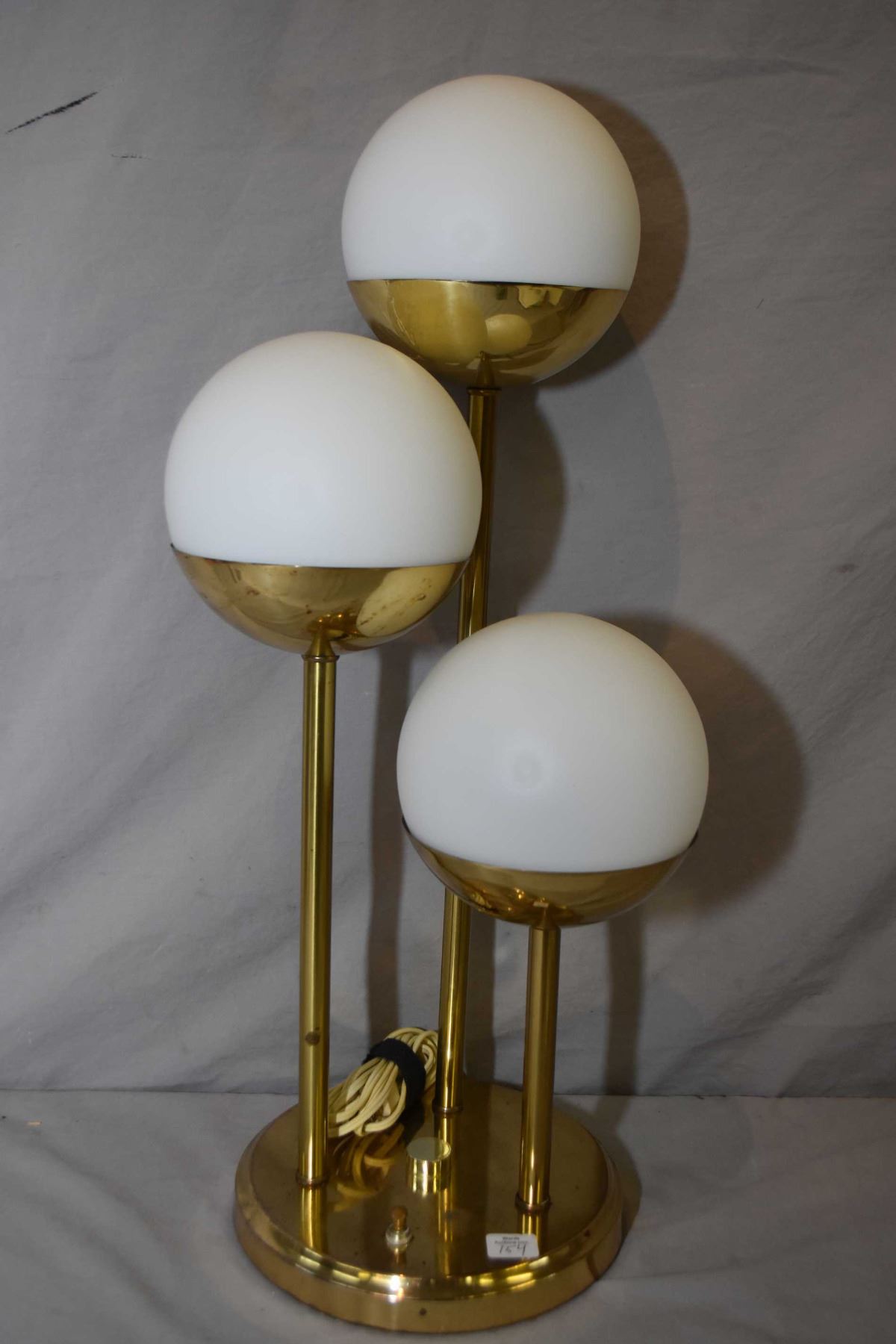 Mid 20th century three branch brass coloured and satin glass table lamp, 24" in height