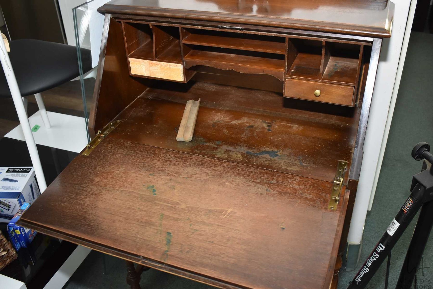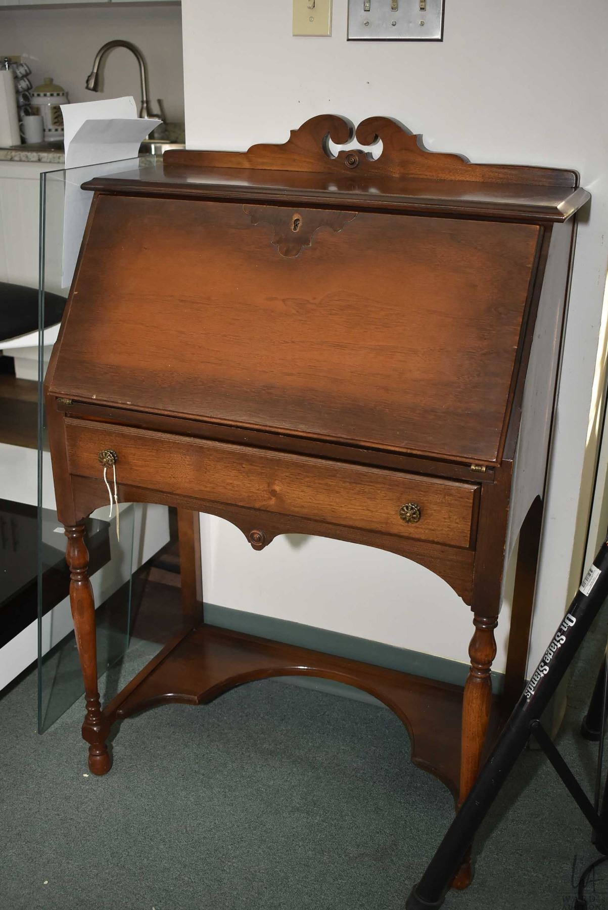 Mid 20th century walnut fall front secretaire with single drawer and fitted interior-note one replac