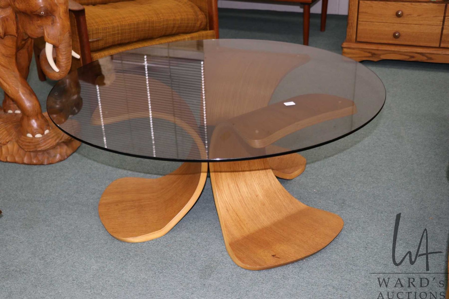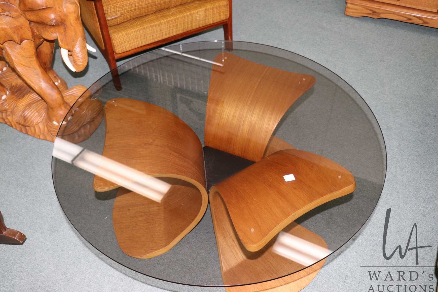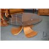 Mid century modern, bend wood petal coffee table with smoked glass 36" diameter top, 16" in height
