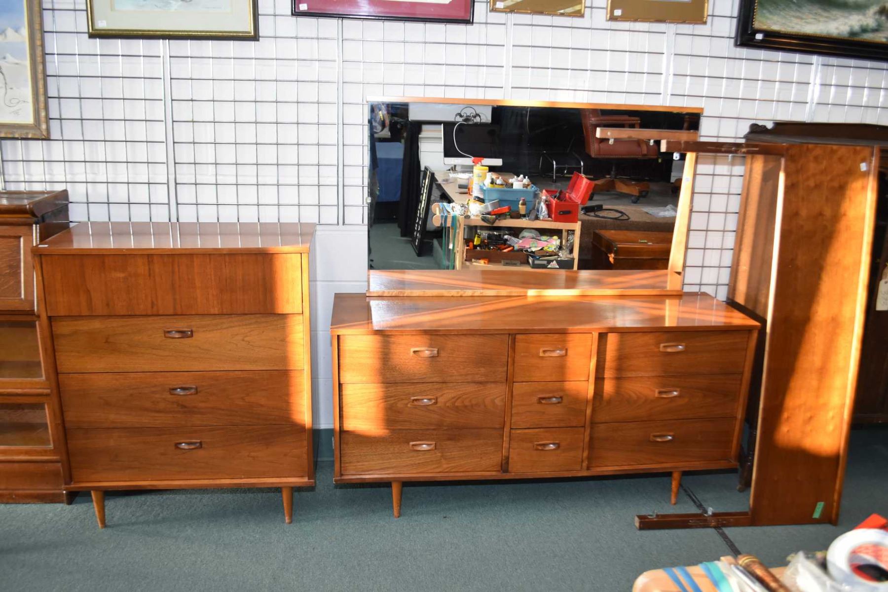 Mid century modern mahogany bedroom suite including four drawer lowboy, nine drawer mirrored dresser and a double sized headboard