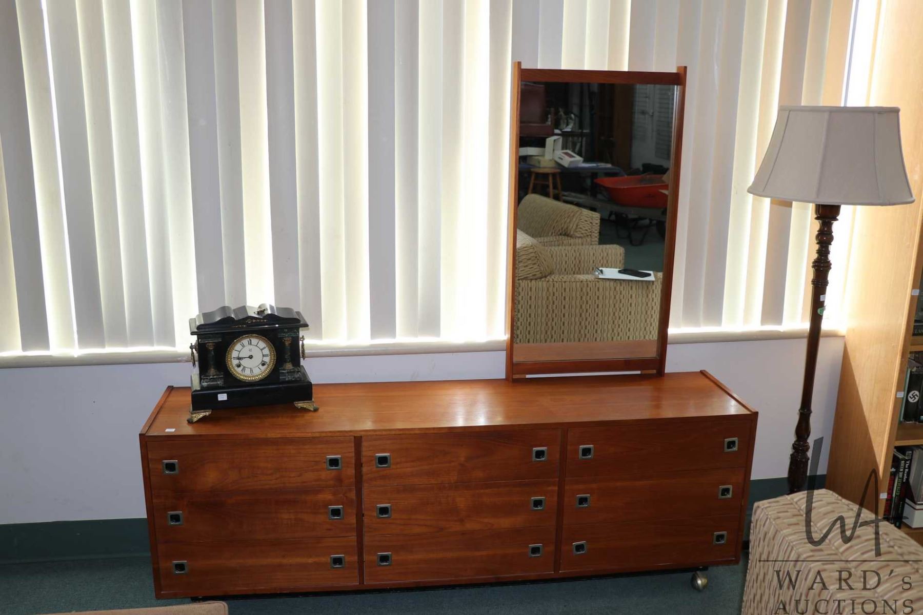 Mid century modern, six drawer mirrored dresser with non-original castors ( original feet not included) 25" X 73" W X 16" D, not including mirror