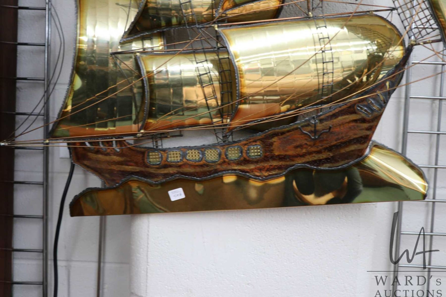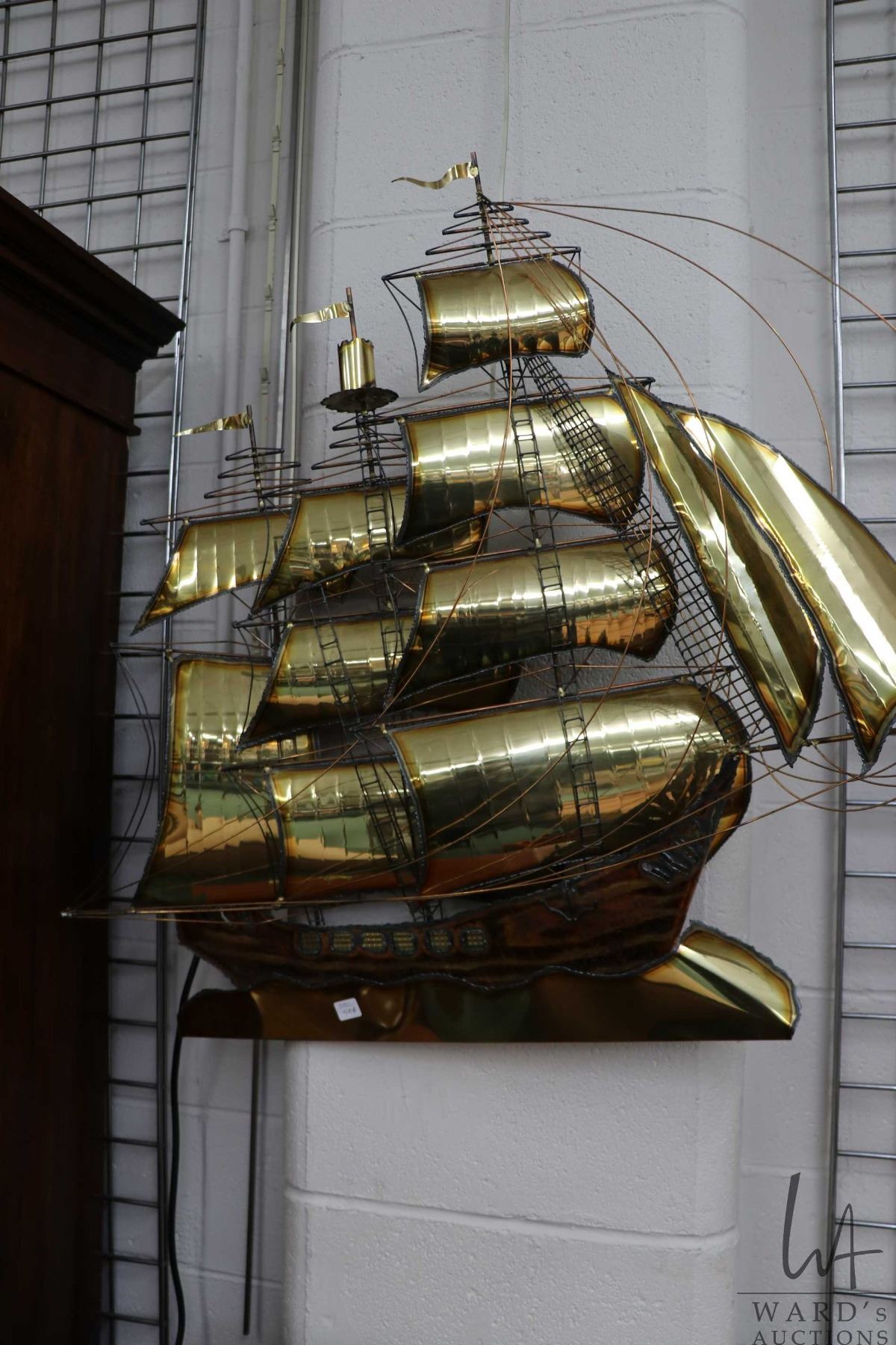 Mid century modern style brass and copper tall ship with full sails wall art made by Torch Art Ltd.