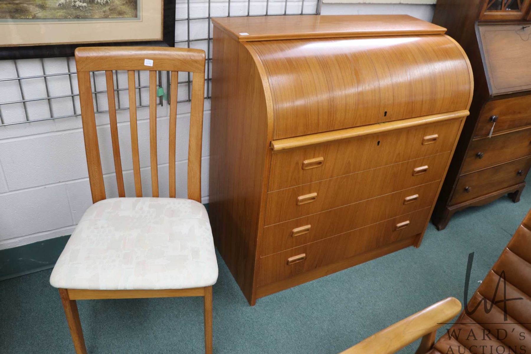 Mid century modern teak cylinder desk with pull out writing surface, fitted interoir and four drawered base, 38" X 36" X 19" plus a complimenting chair made by Nordic Furniture, Ontario. Note: chair has had repair to leg
