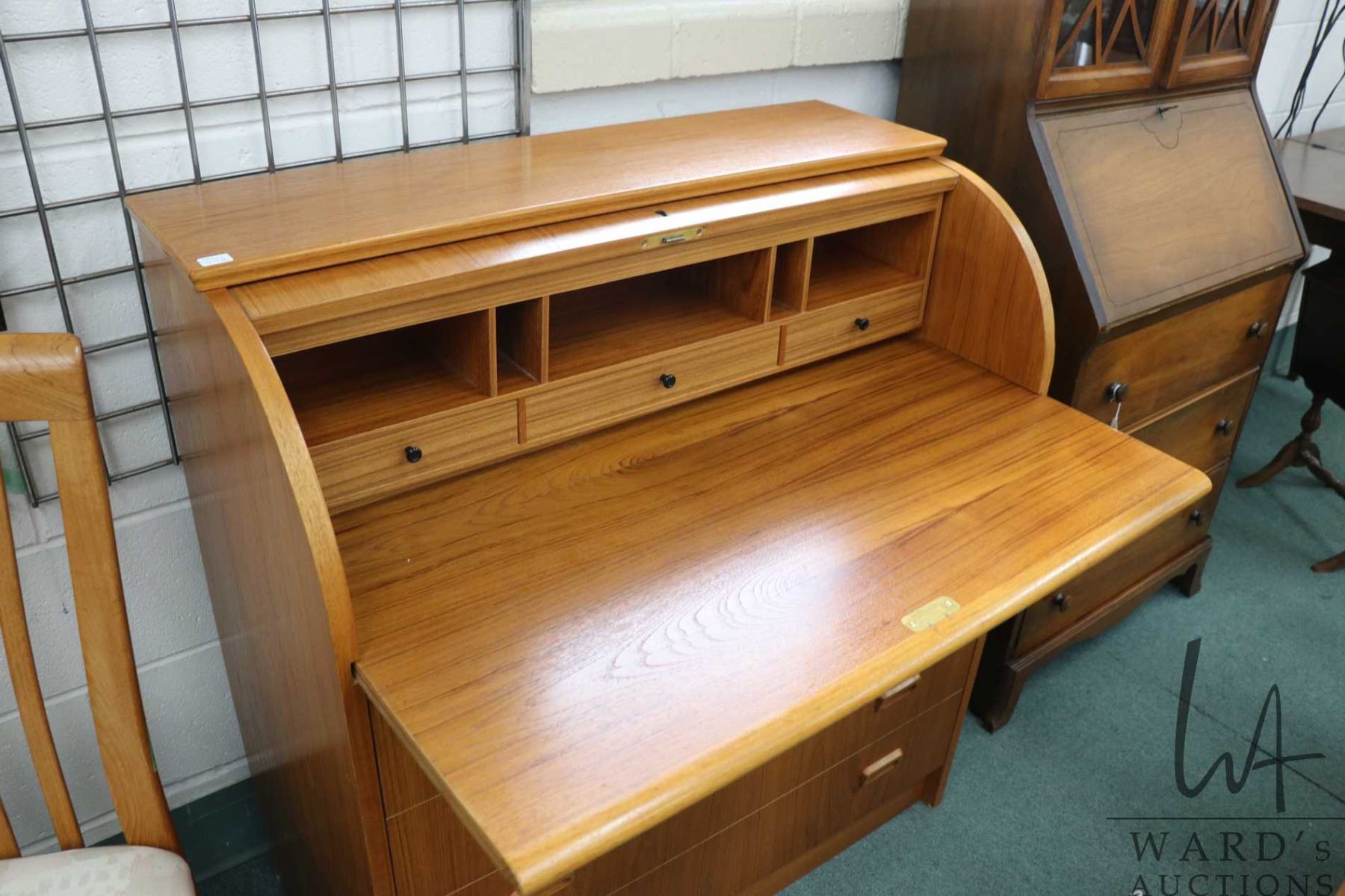 Mid century modern teak cylinder desk with pull out writing surface, fitted interoir and four drawer
