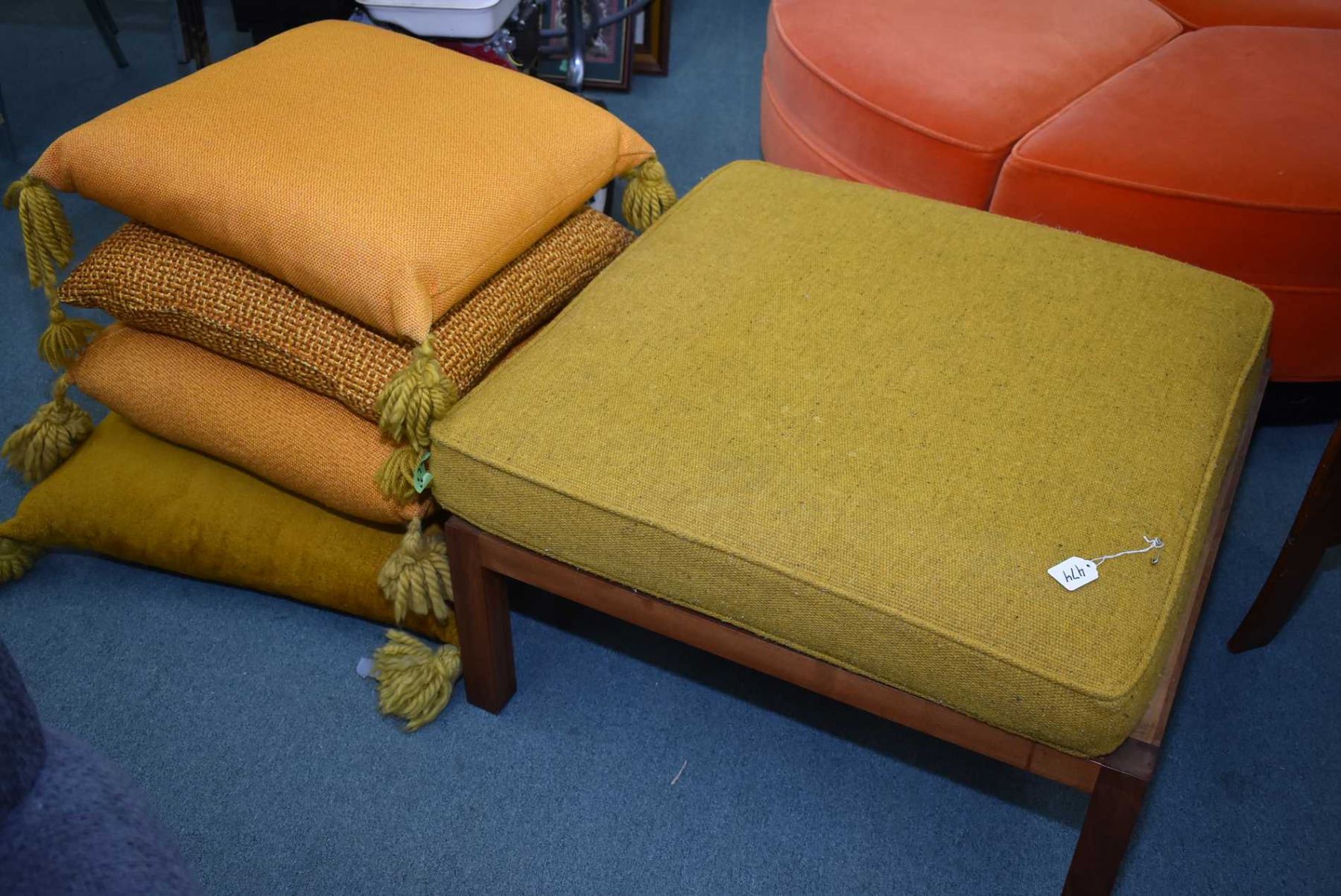 Mid century modern teak framed square ottoman with loose upholstered pad and four floor cushions