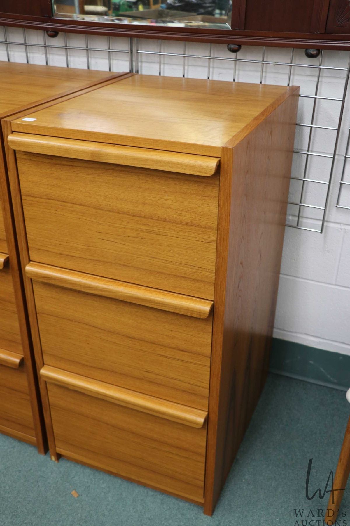 Mid century modern teak, three drawer filing cabinet, note: will fit legal size, 39  X 20  X 24
