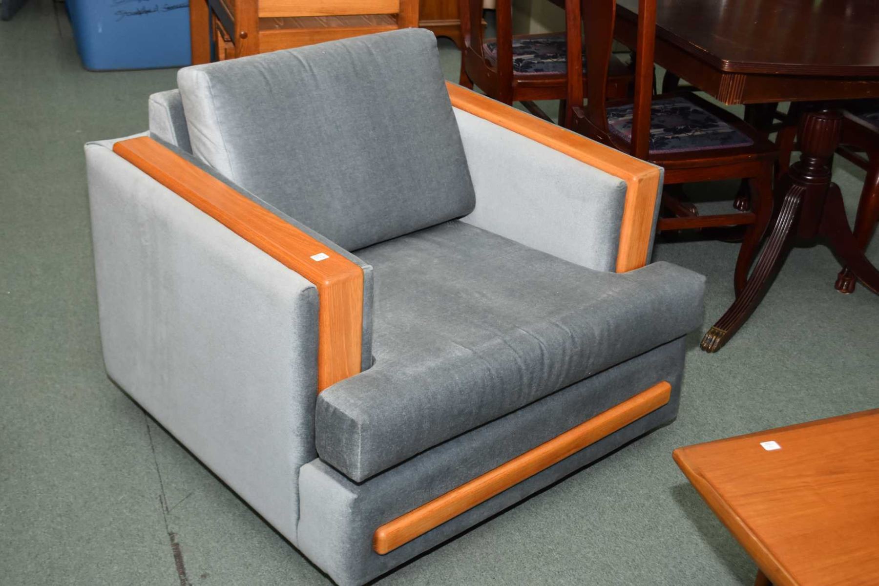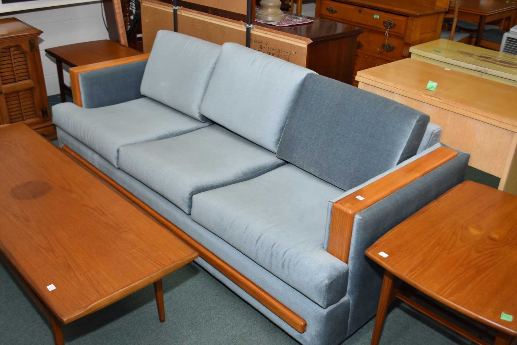 Mid century modern upholstered three seat sofa with teak highlights and matching chair